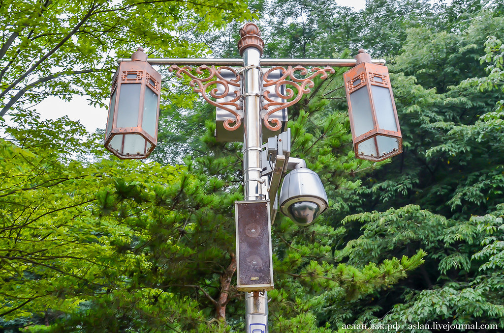 На фонарях висит колонка, откуда раздаются народные мотивы.