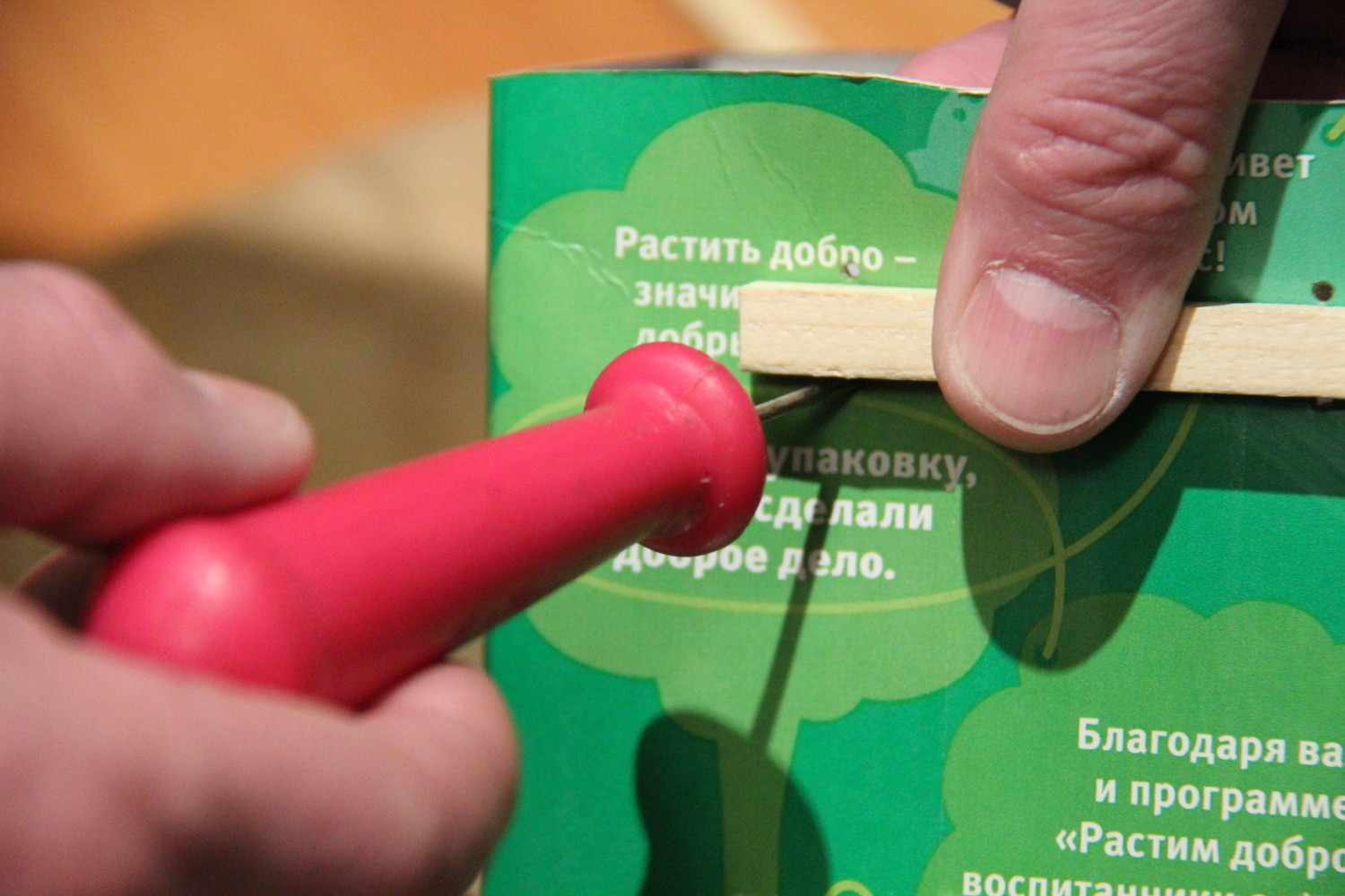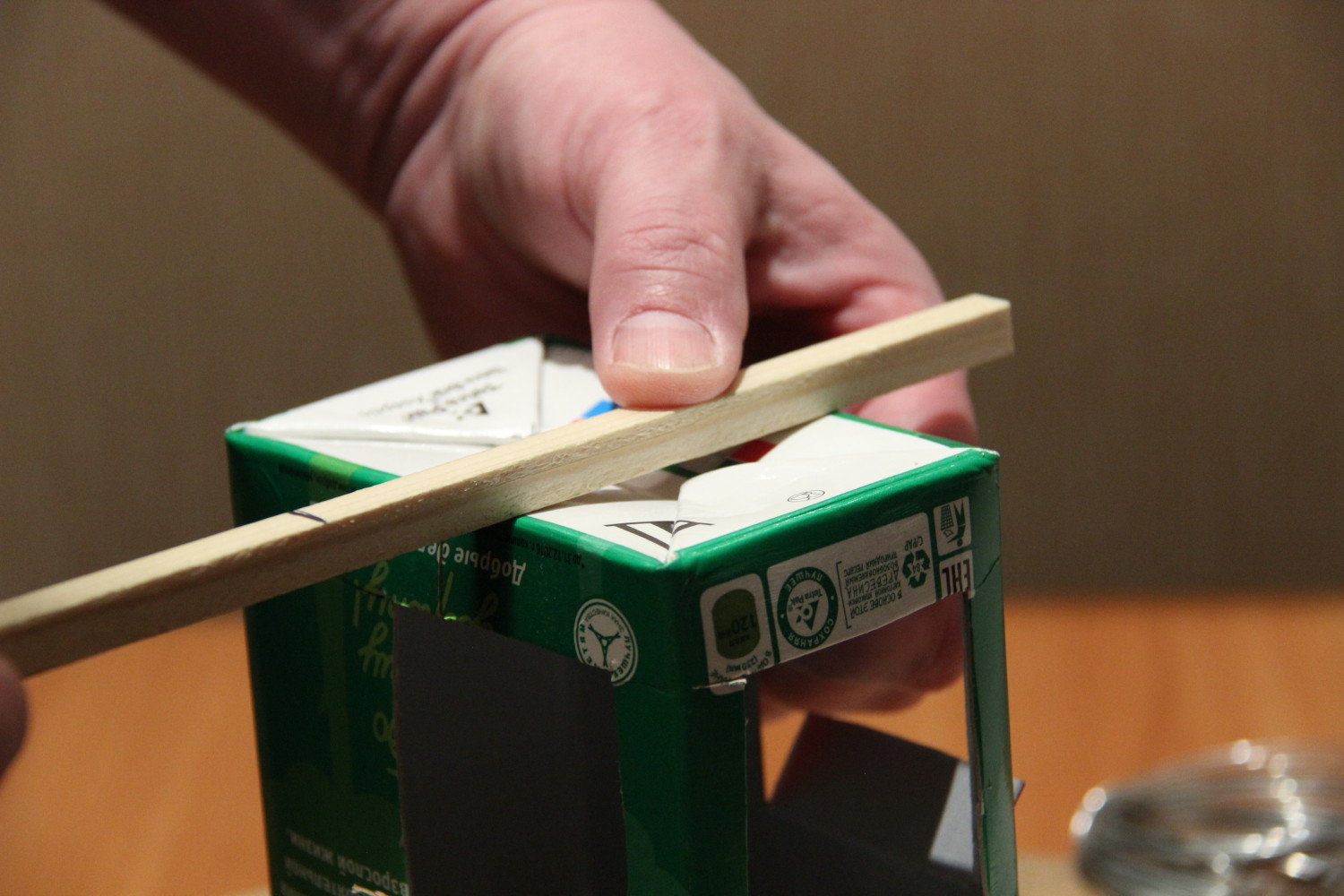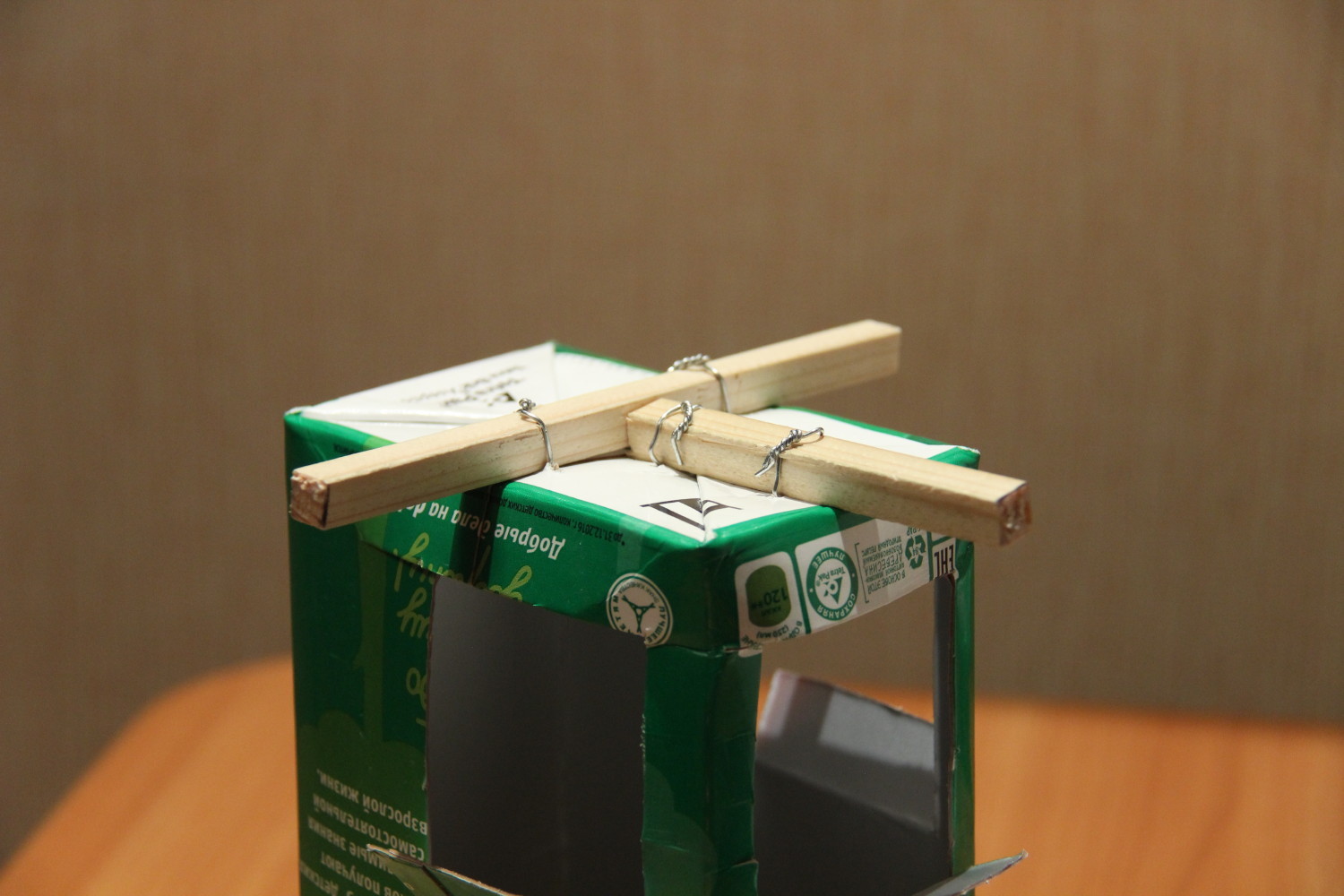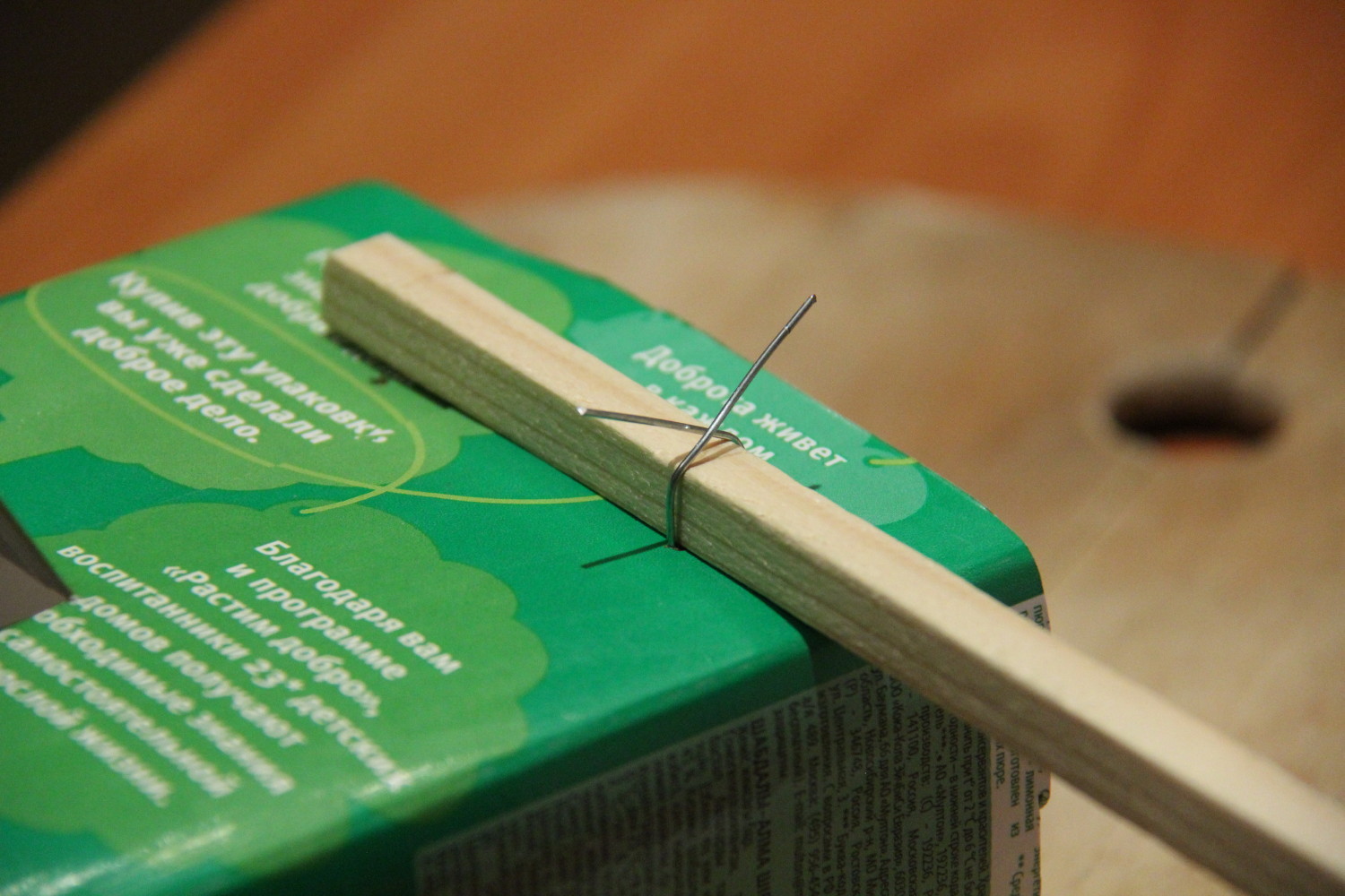 Материалы и инструменты – тут все просто и понятно. 2-литровая коробка из-под сока. Белый лист на фото – обрезок пластика для отделки оконных откосов. Палочка – штапик из хозяйственного. Проволока – любая, достаточно крепкая и мягкая (у нас – стальная, из магазина для поделок).
