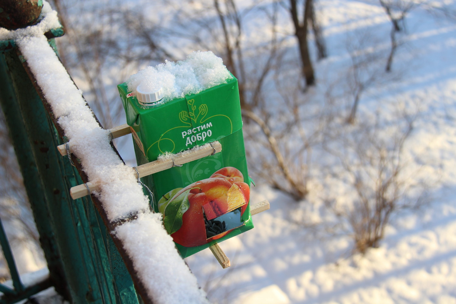 Её можно сделать из любого материала, лишь бы он не прогибался, не промокал и был достаточно гладким – по нему должны съезжать семечки/корм. В прошлом году мы делали ее из картона, обмотанного скотчем, ничего, сезон выдержала.