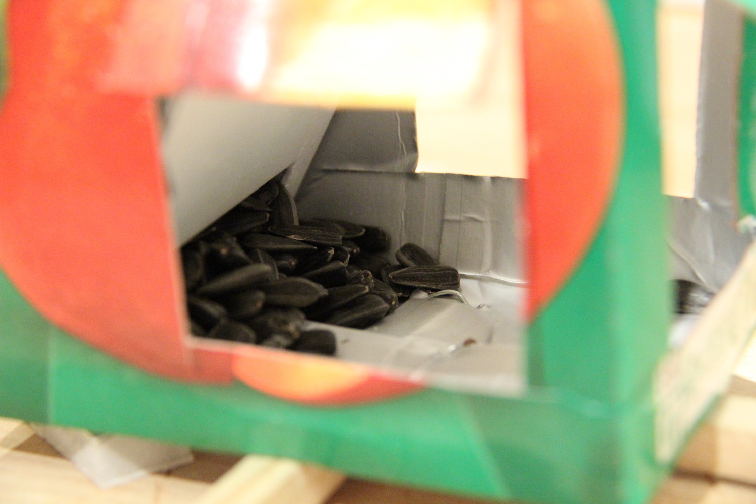 Здесь важно не переборщить с глубиной этого выреза – если сделать его широким, то весь запас семечек быстро съедет вниз, если слишком узким, то они будут застревать. Поэтому можно сначала сделать вырез поменьше, а после испытания, при необходимости, увеличить – перегородка в готовой кормушке ничем не закрепляется и вынимается свободно.