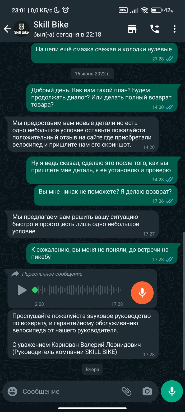 2954 kusarik Сервис Коротко об отзывах на Wildberries1 3 года назад Приобрел велосипед на wildberries, залюфтила каретка на второй-третий день, потом заскрипела, да да, я знаю, что лох, купил дёшевый велик. Решил написать продавцу напрямую, дальше скрины разговора. UPD. [моё] Покупка Негатив Отзыв Нечестно Велосипед Wildberries Длиннопост Переписка Скриншот 60 6 2 Ещё 0