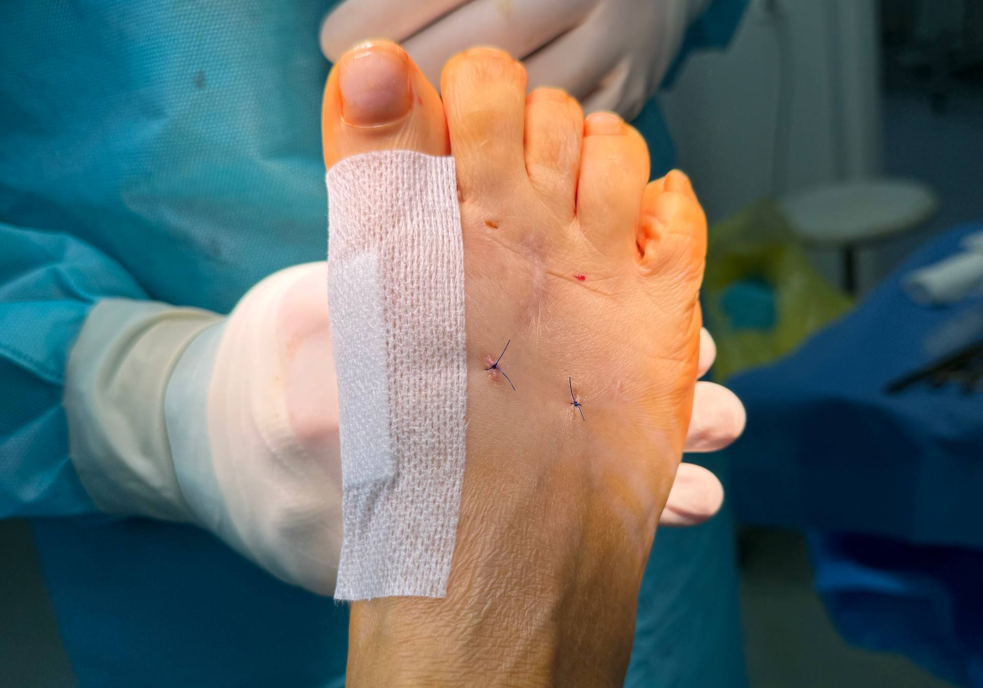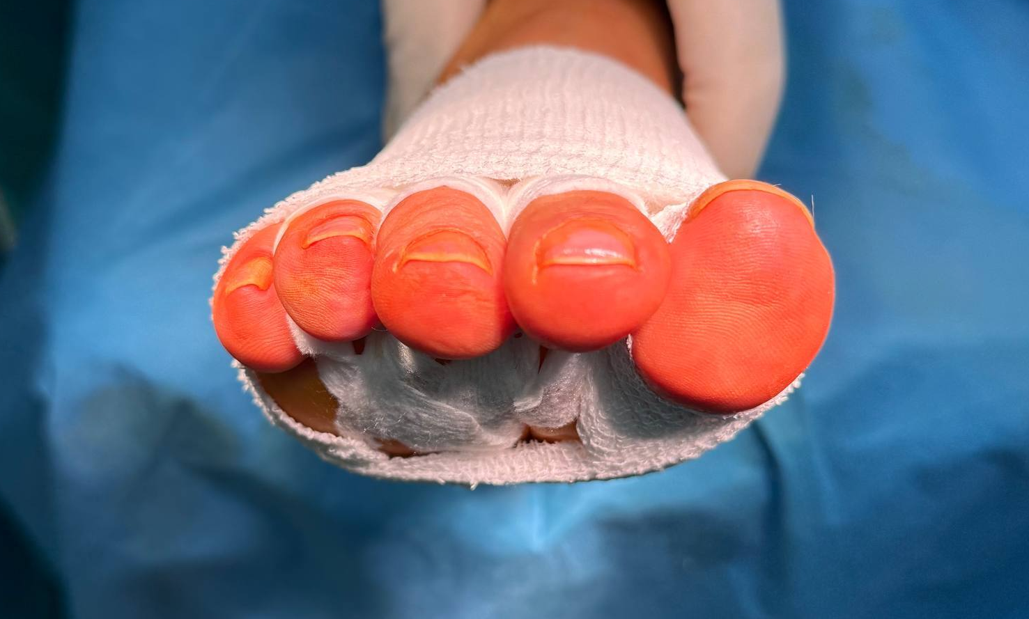 Внешний вид стопы. Зашитые раны соответствуют уровням остеотомии 2 и 4 плюсневых костей. Проколы соответствуют уровню тенотомии: важно выполнять на уровне плюсне-фалангового сустава, т.к. там находится капюшон разгибателя.