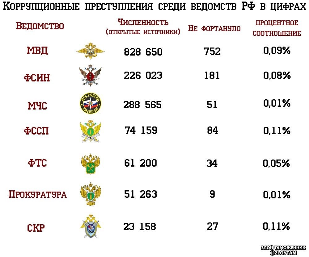 Да, приведённые цифры нельзя назвать точными, но в целом демонстрируют наглядную картину. Наиболее объективные цифры по таможенникам, фсиновцам и приставам. Во-первых, большая масса сотрудников ежедневно имеет общение с потенциальными взяткодателями. Во-вторых, эти ведомства не обладают значимой влиятельностью и имеют меньше рычагов в случае нехороших сценариев. Шанс, что за таможенника или пристава кто-то впишется невелик (если это не фигура высокого полёта).