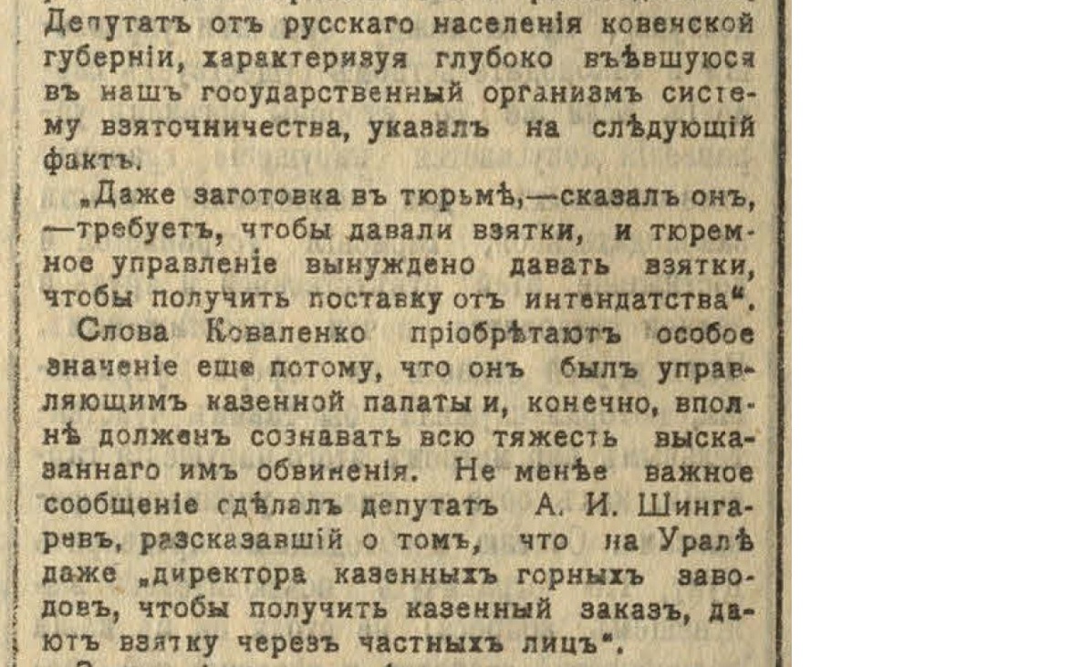 "Одно из последствий "Обновленного строя" — усиливающееся взяточничество. Россия издавна славилась взяточничеством. Но такого повального грабежа, такого беззастенчивого обирания обывателя, как в наши дни, еще не бывало.