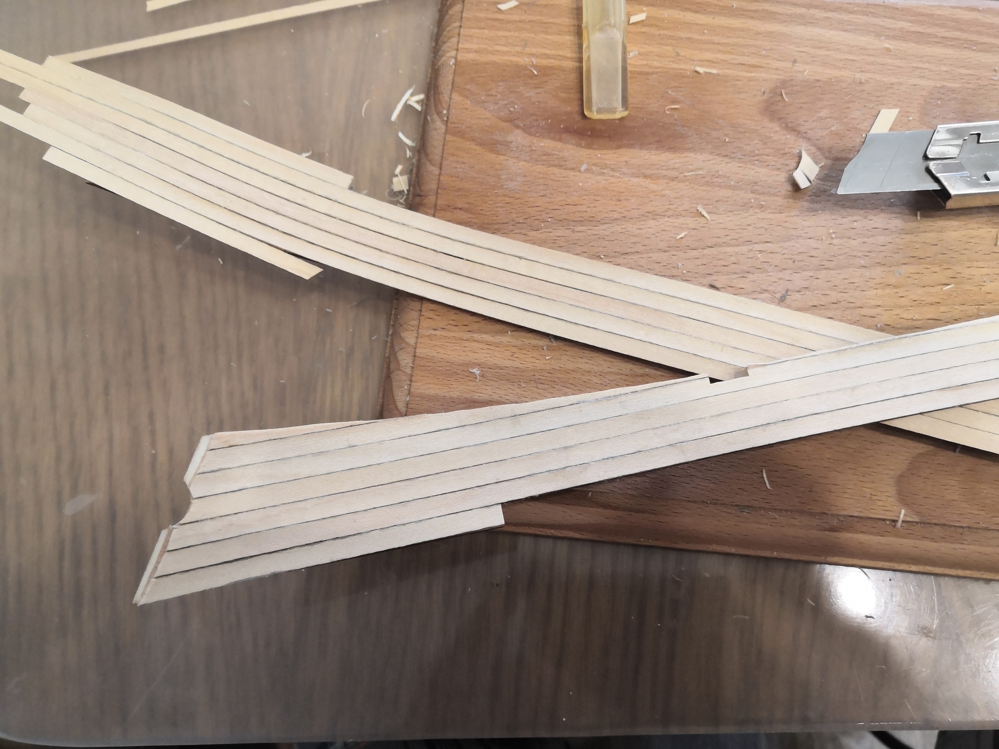 Самое муторное в сборке корпуса, как мне кажется, это установка фальшбортов. Сначала задача казалась вполне себе простой: намочить, изогнуть с помощью горячего утюга, обклеить рейками, приклеить к корпусу.