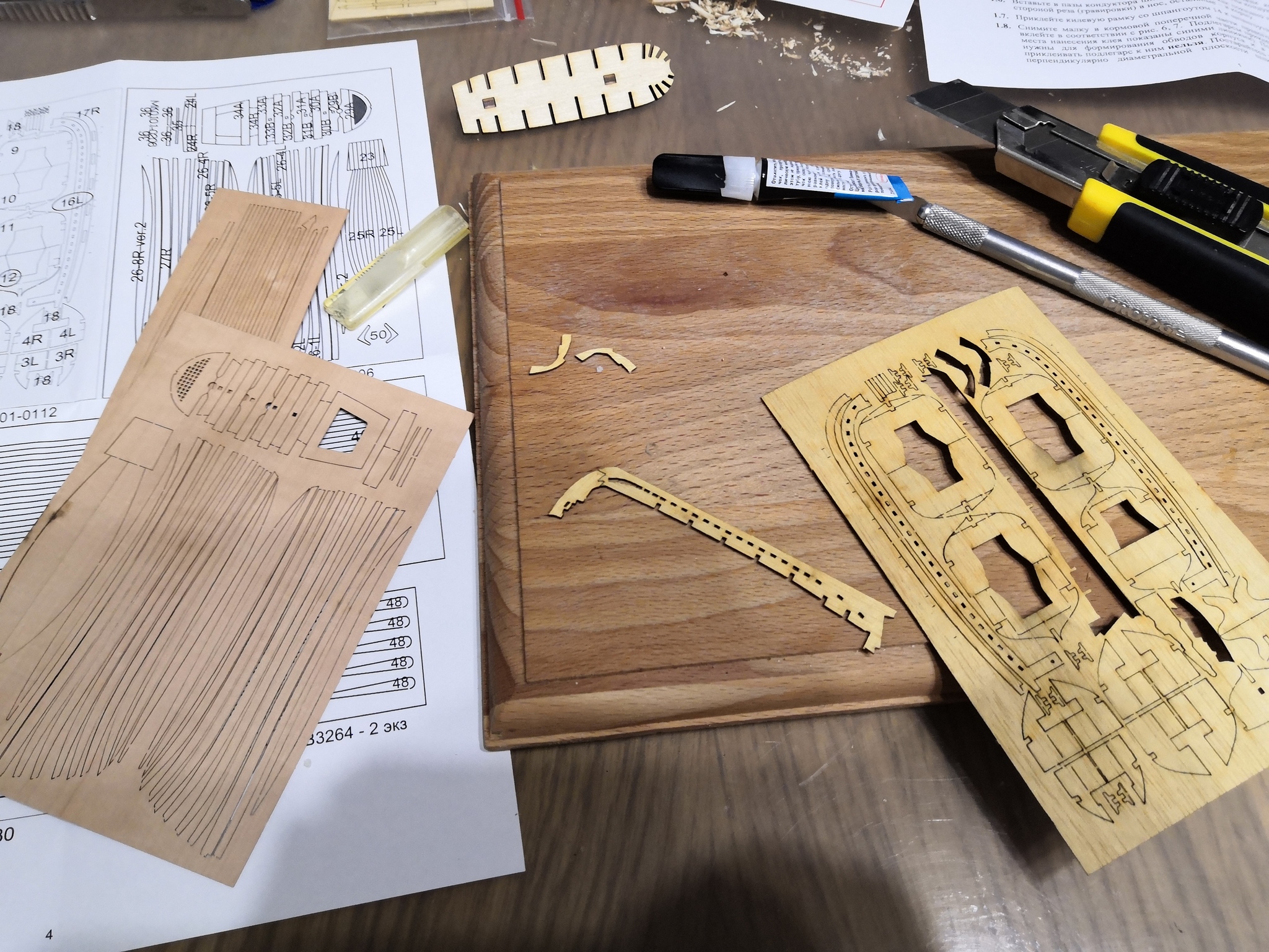 Дальше идёт черновая обшивка корпуса. В интернете я не нашёл какой-либо инструкции или фоторепортажа о том, как её выполняют конкретно на моей модели, так что приходится руководствоваться картинками из инструкции и видеороликами со сборкой других моделей. Забегая вперёд, скажу, что я уже нехило накосячил. Надеюсь, смогу это исправить...