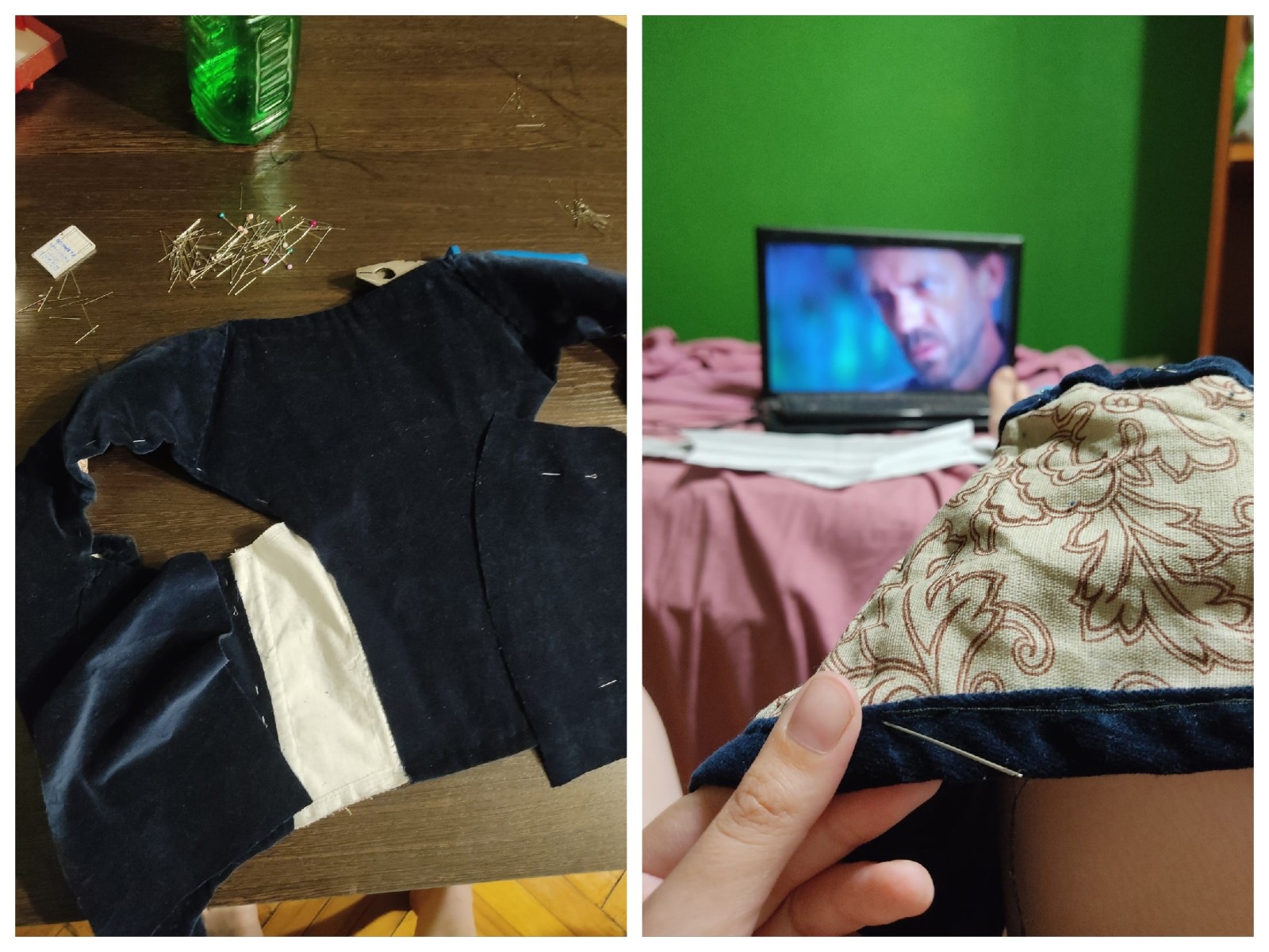 Далее - перенос выкройки на подкладочную ткань (смесовая лён-хлопок с однотонным принтом. Подобные в 17 века делались штампами по ткани). Пришивание подклада. И последним выкраивался и пришивался подетально бархат наверх. Верхний бархат для эстетизма внешнего и для большей аккуратности посадки пришивался вручную под сериал.