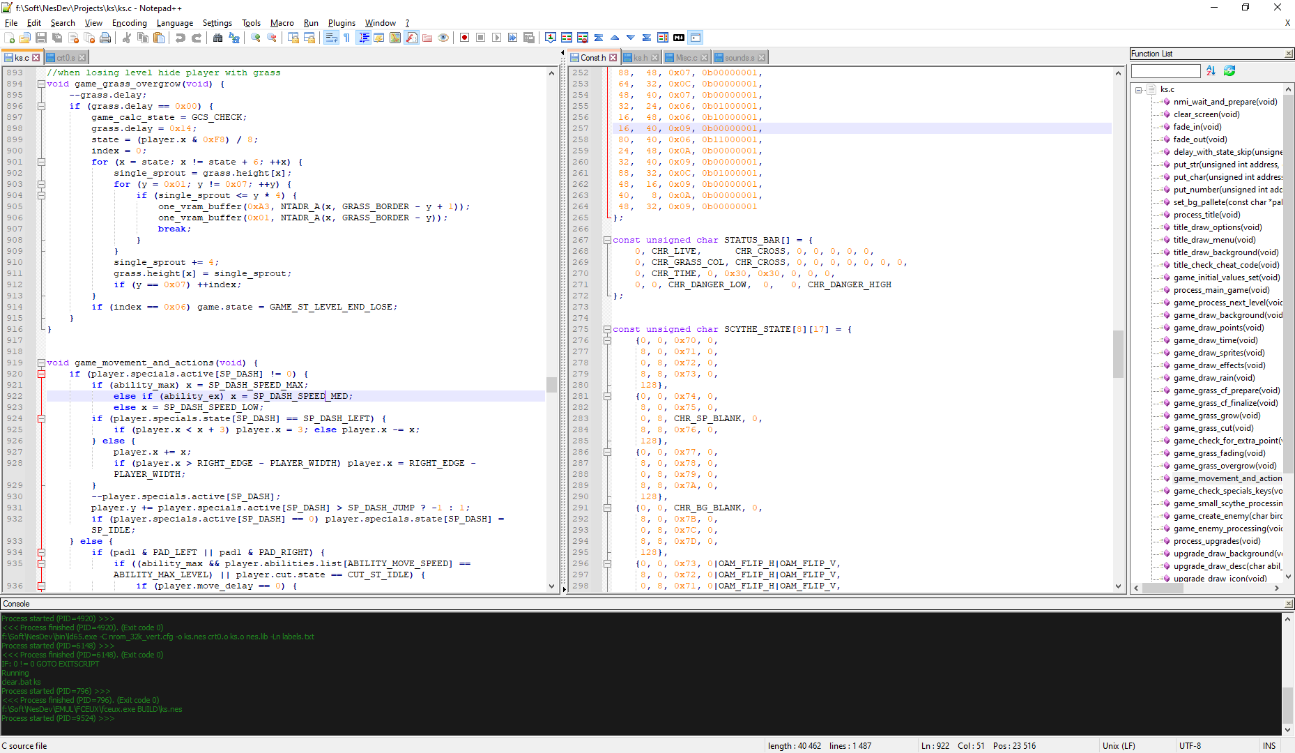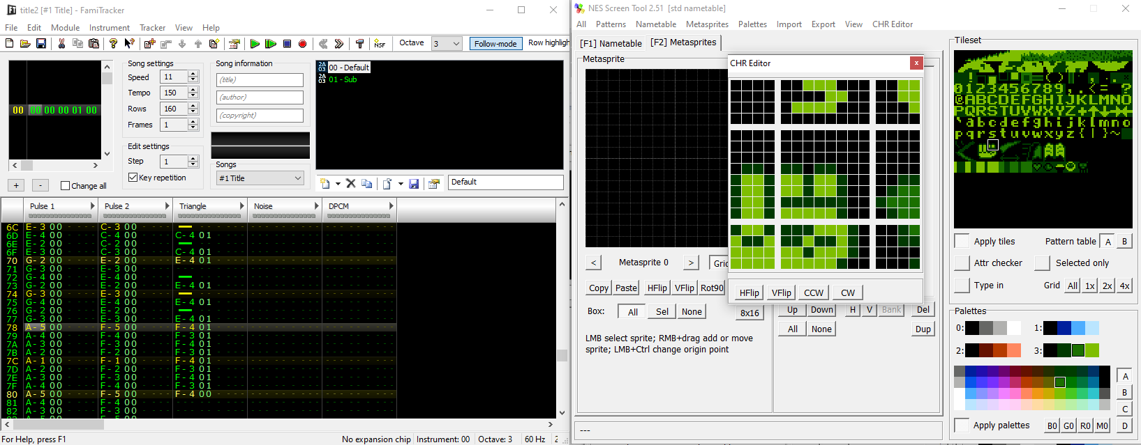 Вся разработка велась в NP++ с плагином NPPExec, большего в общем не требовалось. Музыка в Famitracker, графика в Nes Screen Tool, так что весь процесс выглядит вот так: