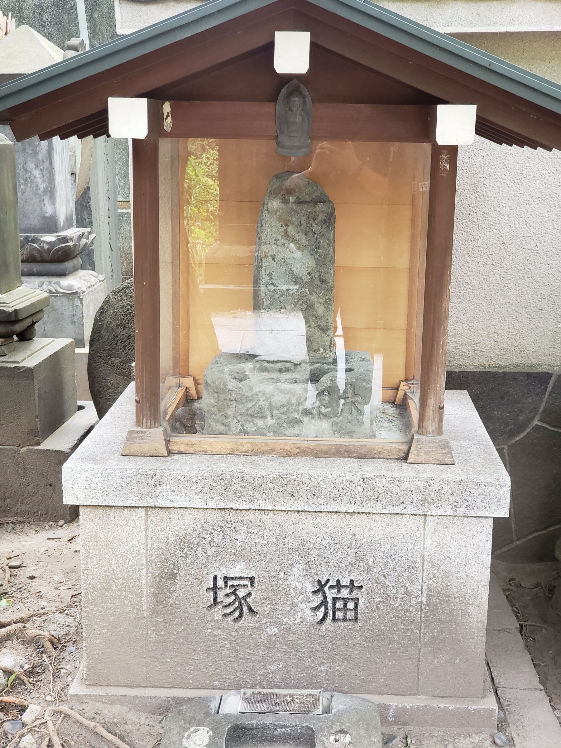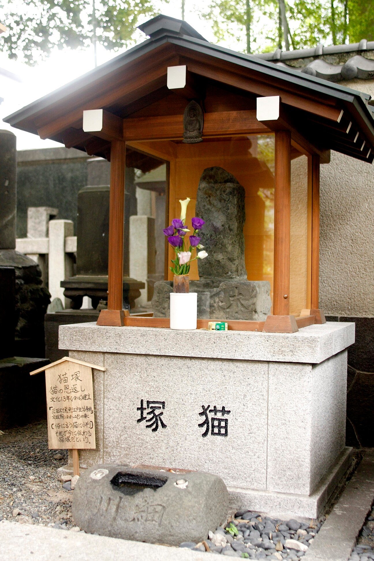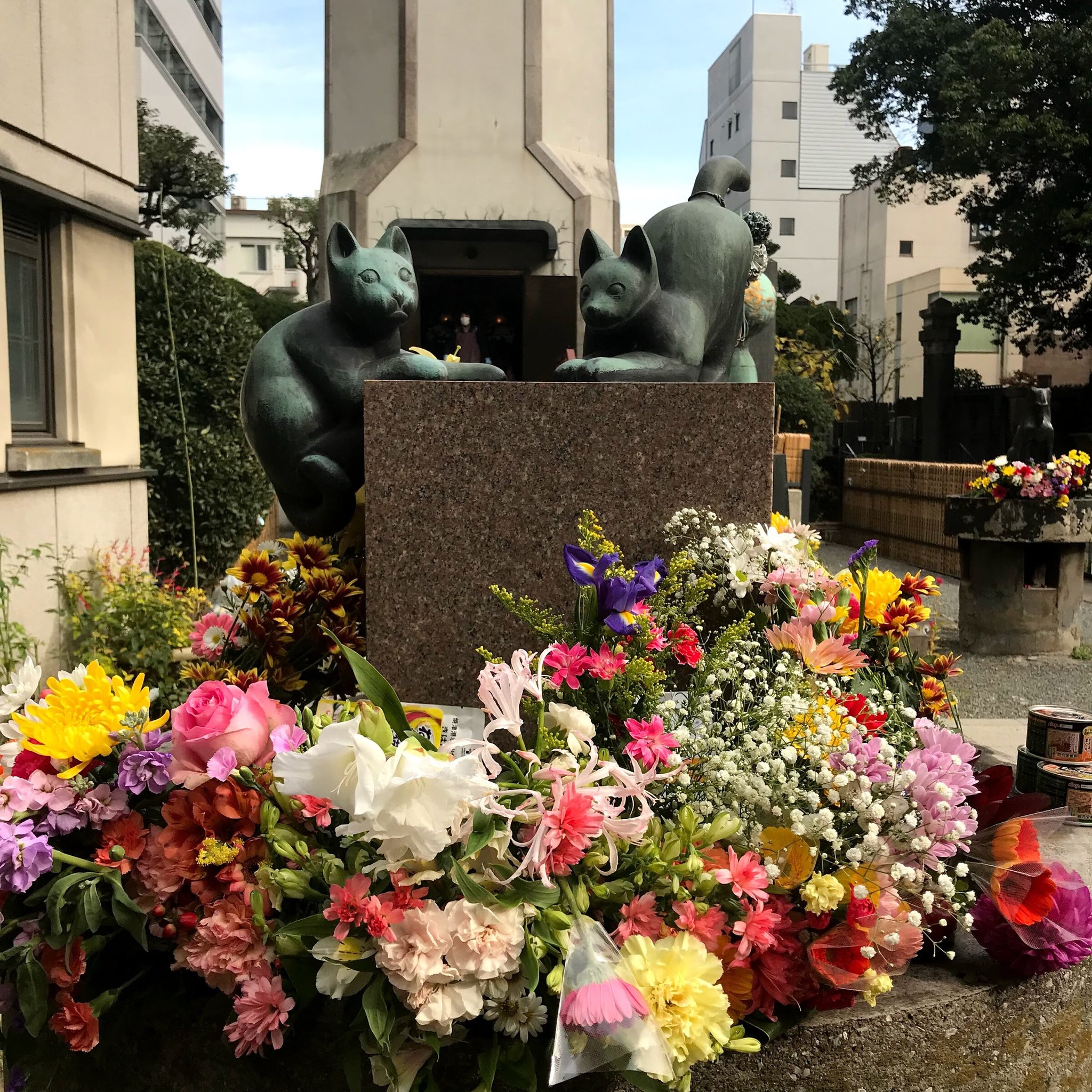 Кошачьи захоронения и статуи в храме Эко:-ин в районе Рю:гоку, Токио.