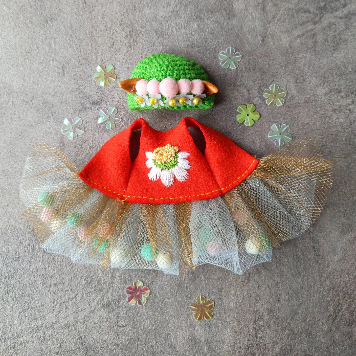 Цветочек на платье вышито вручную в технике - вышивка гладью. Шапочка связанна крючком и украшена текстильными помпонами и пайетками.