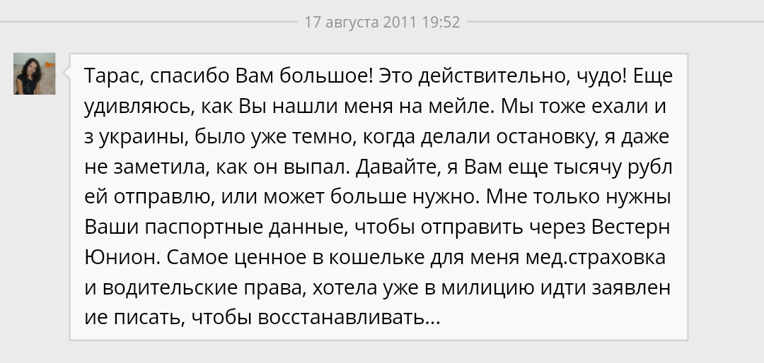 Как-то с семьёй ехали по Беларуси. Трасса ровная, долгая, яркие заборчики, разноцветные валуны у дороги (кто проезжал, тот поймет). Конца у шоссе не видно. И устал я за рулём немного, задница затекла да и в кусты бы по малой нужде не прочь. И вот, отец уже готов меня подменить, но дай думаю ещё пол часа проеду, не знаю почему. Подходит примерно 30 минут, я останавливаюсь близ поселка Ильич, выхожу, потягиваюсь и направляюсь к обочине. Поодаль от правого переднего колеса, в траве, еле-еле замечаю что-то чёрное, смотрю ближе-кошелёк. Вот те на. Ладно, взял, думаю, потом разберусь. Нужду справил. Едем. Я начал анализировать содержимое. Медстраховка, водительское удостоверение, много всевозможных карт лояльности, все на имя некой Екатерины Павловой, и несколько сот рублей. Я недолго думая, начал поиски по соц. сетям. И какого было мое удивление, когда я нашел ее в Моём Мире. Ни в ВК, ни в Одноклассниках - в Моём Мире! В итоге, таки связался с владельцем, всё объяснил - сказать что гражданка Павлова была в шоке, это ничего не сказать. Отправил ей все добро на те деньги что в кошельке и остались, ибо другого варианта в голову даже и не пришло, чужого мне не надо. И вот спустя годы, я все думаю - метр ближе, метр дальше и его бы вероятнее так и не нашли. Ни я, ни кто-либо другой...