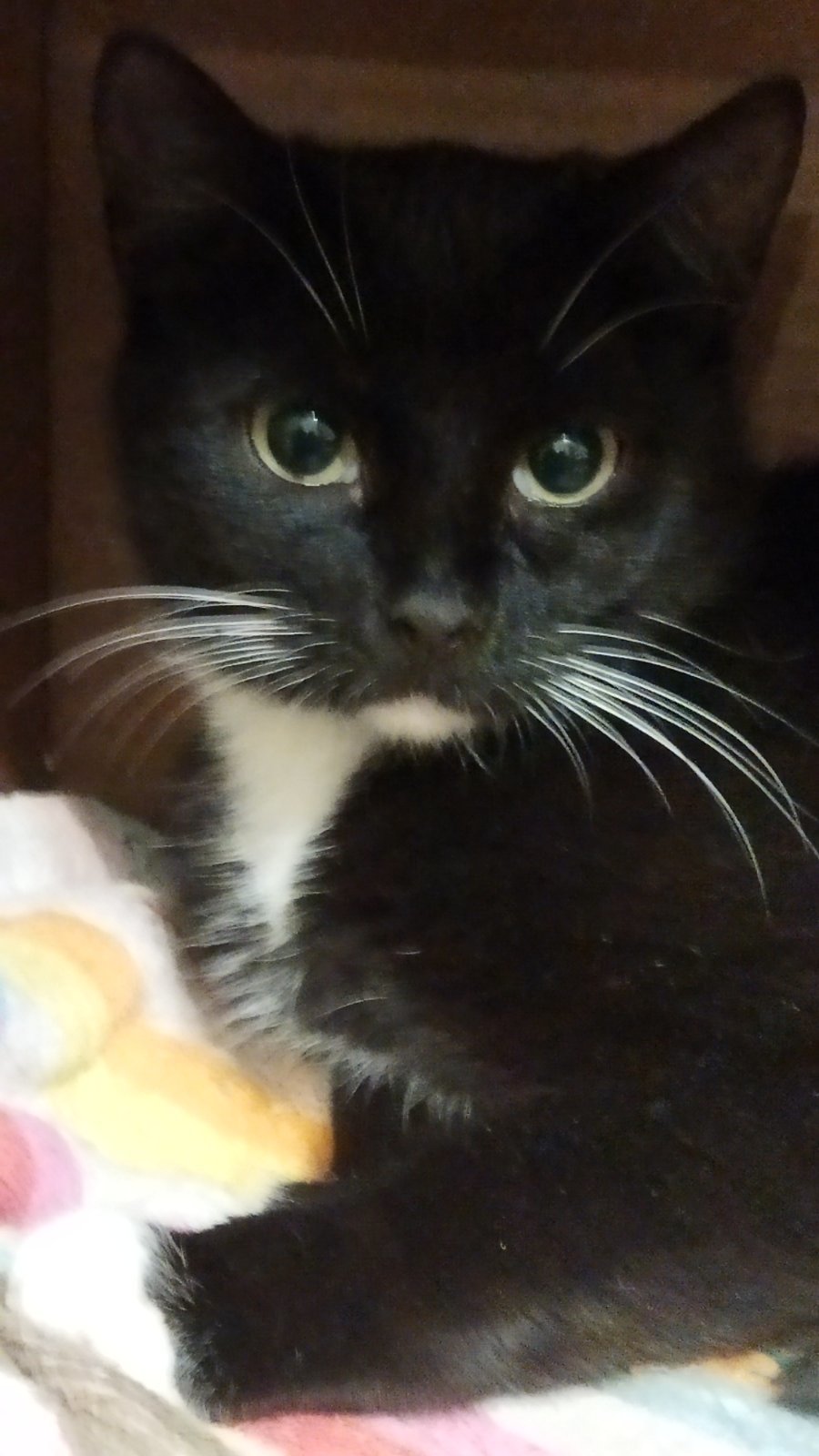 Очень красивая (черная с белой грудкой, белыми лапками и усами), небольшая (2-2,5 кг), гладкошерстная.