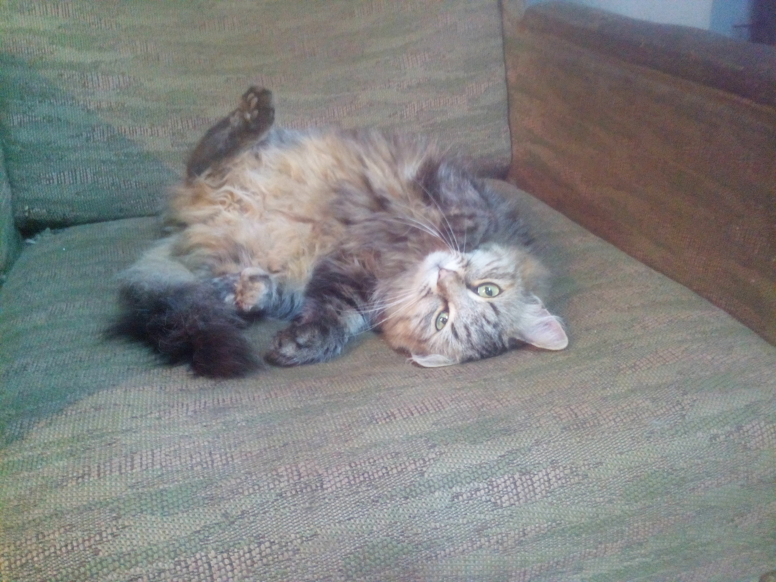 Стерилизована, гиперактивна, игрива, возраст около двух лет. В еде предпочитает куриные лапы (пальцы), варёную рыбу и/или кошачий корм.