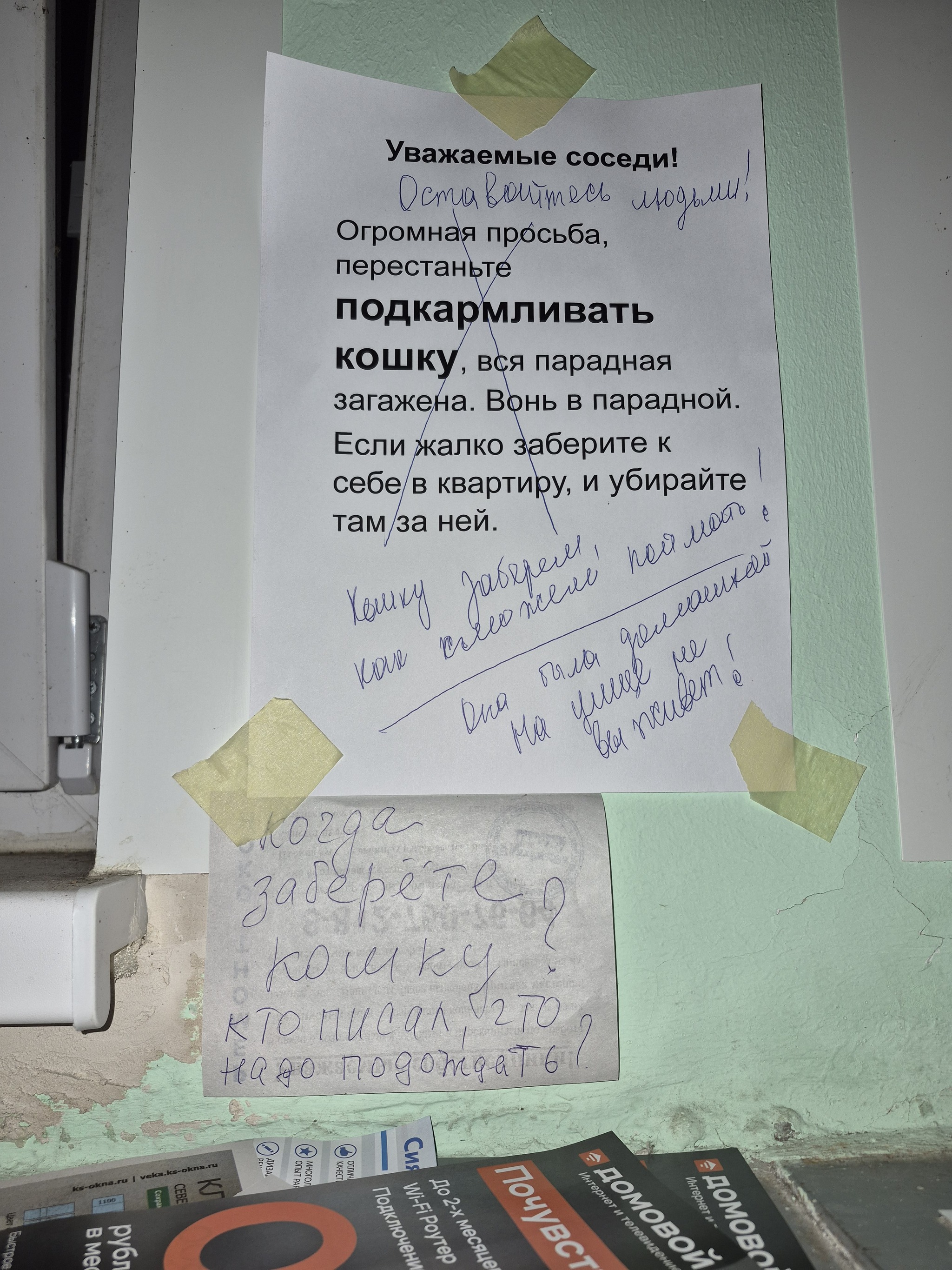 Нетерпение и раздражение соседей, помощи не предлагают, им кто то должен...А к тем, кто выкинул, претензий нет( Мы и так как на работу ходит пытаемся её поймать, но помощи от соседей нет. Всем некогда.