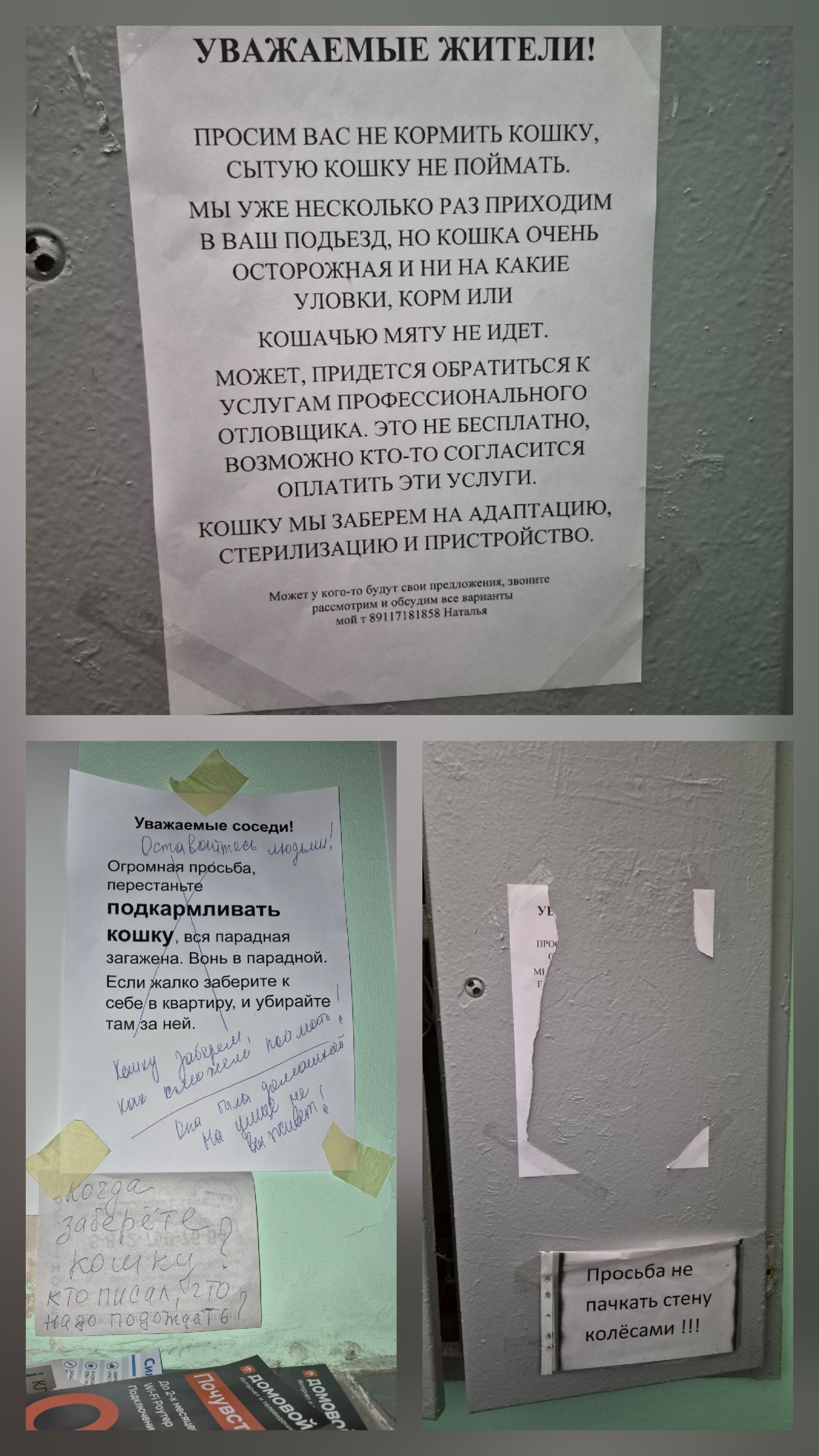 Клеим объявления, просим их нам помочь, но все сразу закрылись в своих квартирах. Мало того объявления срываются и пишут ответные, сколько ждать? Когда заберёте? Очень негативно относятся и к кошке, и к тем кто им откликнулся помочь.