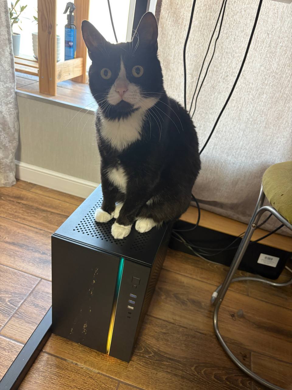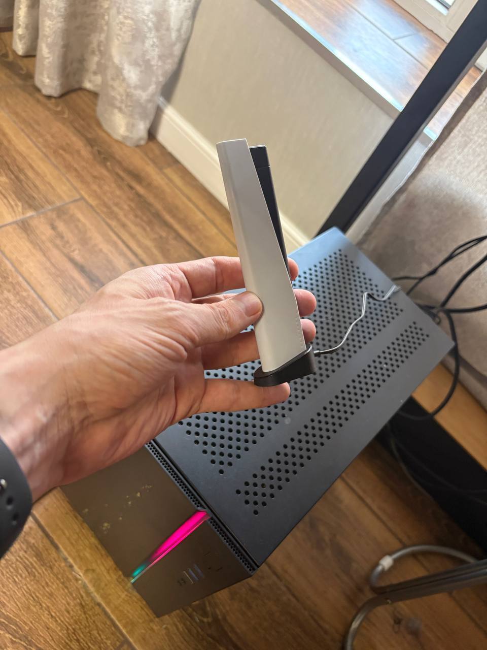 Используем то, что под рукой. Wi-Fi приемник. За счет магнита крепко держится за металлический корпус компа, не преграждает притоку воздуха и не дает кошке лежать на корпусе