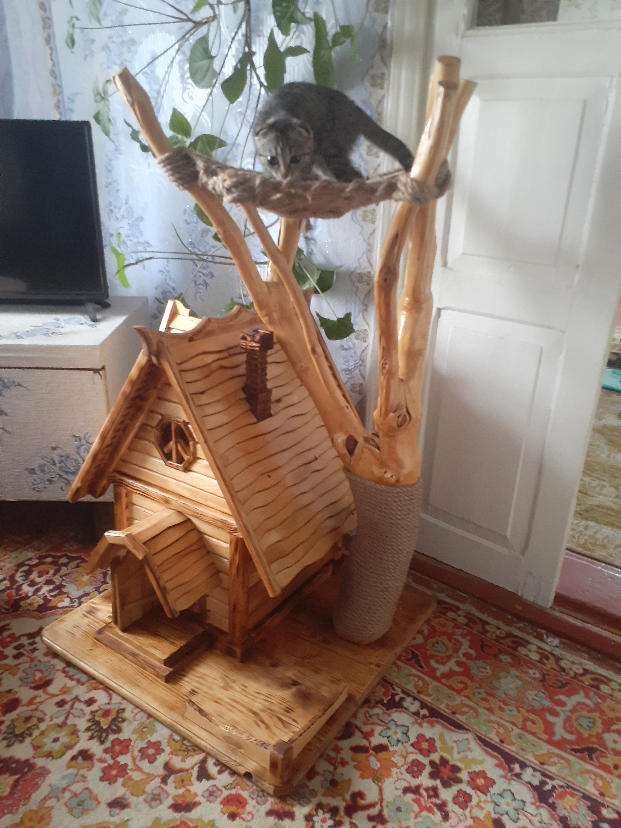 Привет всем). Кошкин дом, собран весь из отдельных косточек, гвоздики и саморезы спрятаны, вся веревка пробита гвоздиками в особенности гамак, все гвозди спрятал в веревке, чтобы узлы не теряли вида, сам гамак тоже переплетен на узелки всё с той же целью)) всё проклеяно, каждая рейка, так что на него хоть встань, ничего не отломится), дерево прикоучино на 8 ~12-14см утолщенными саморезами через польшую металлическую пластину под которую был выбран паз в столешнице, всё с целью сделать всё очень коепко... делал долго по чуть чуть, не на продажу, а просто в дом, вся идея и исполнение авторское, дощечки обожжены гарелкой, и накрыты безвредным лаком пропиткой на два раза, изначально было всё гораздо проще в голова, но как говорят аппетит появляется во время еды)) и да, подскажить всётаки сколько он будет стоить, ну любопытно)))