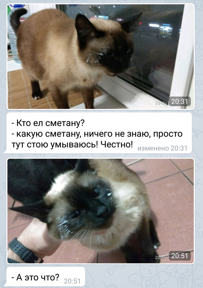 Муж отошёл на минуту из кухни, а кошка сразу начала шариться по столу (обожает сметану, но ей нельзя). Когда обнаружил её, делала вид, что не при делах. Так и не созналась.