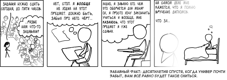 У меня так снится периодически сон. Экзамен по истории в универе. А я проебался по полной. Не ходил и не сдавал ничего вообще. Думаю, "ну, пиздец", а потом просыпаюсь и думаю, блядь, какая это хуета, сейчас проблемы значительно серьёзней.