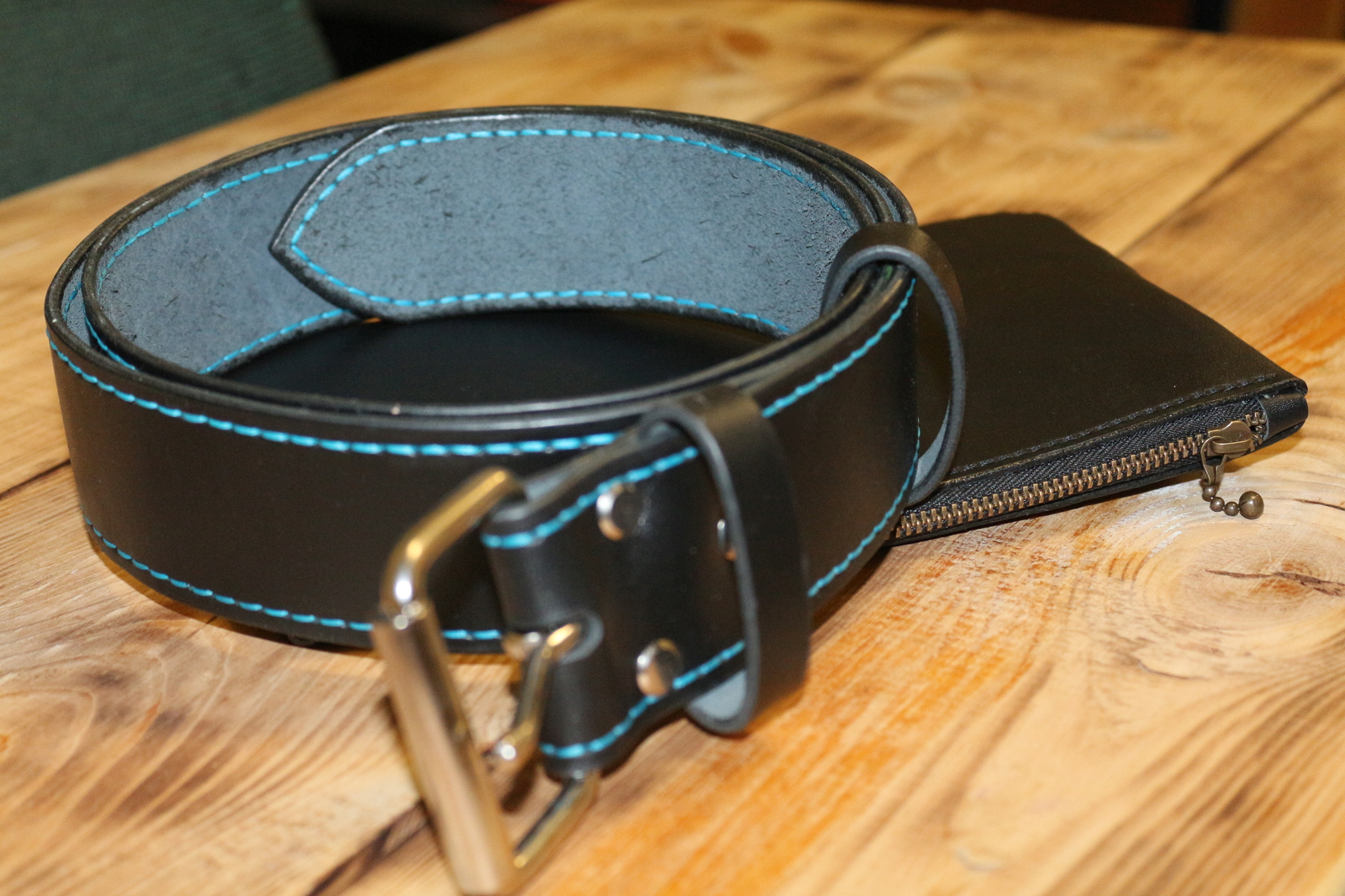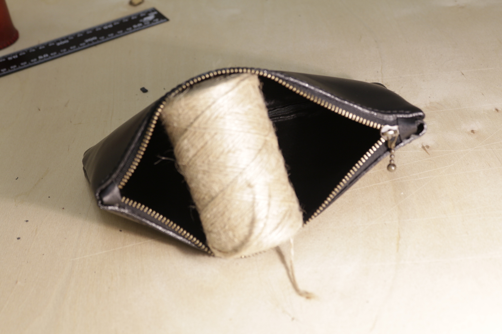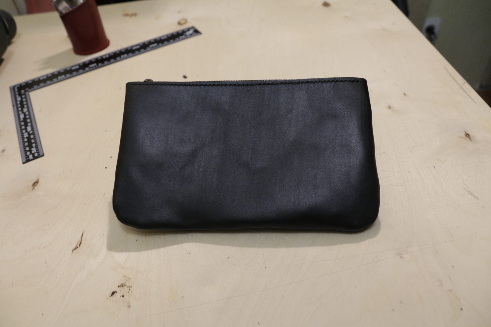 1. Косметичка. Впервые делал изделие с внутренним швом, поэтому есть косяки. Буду исправляться. (фото сделаны сразу после завершения, на рабочем столе)