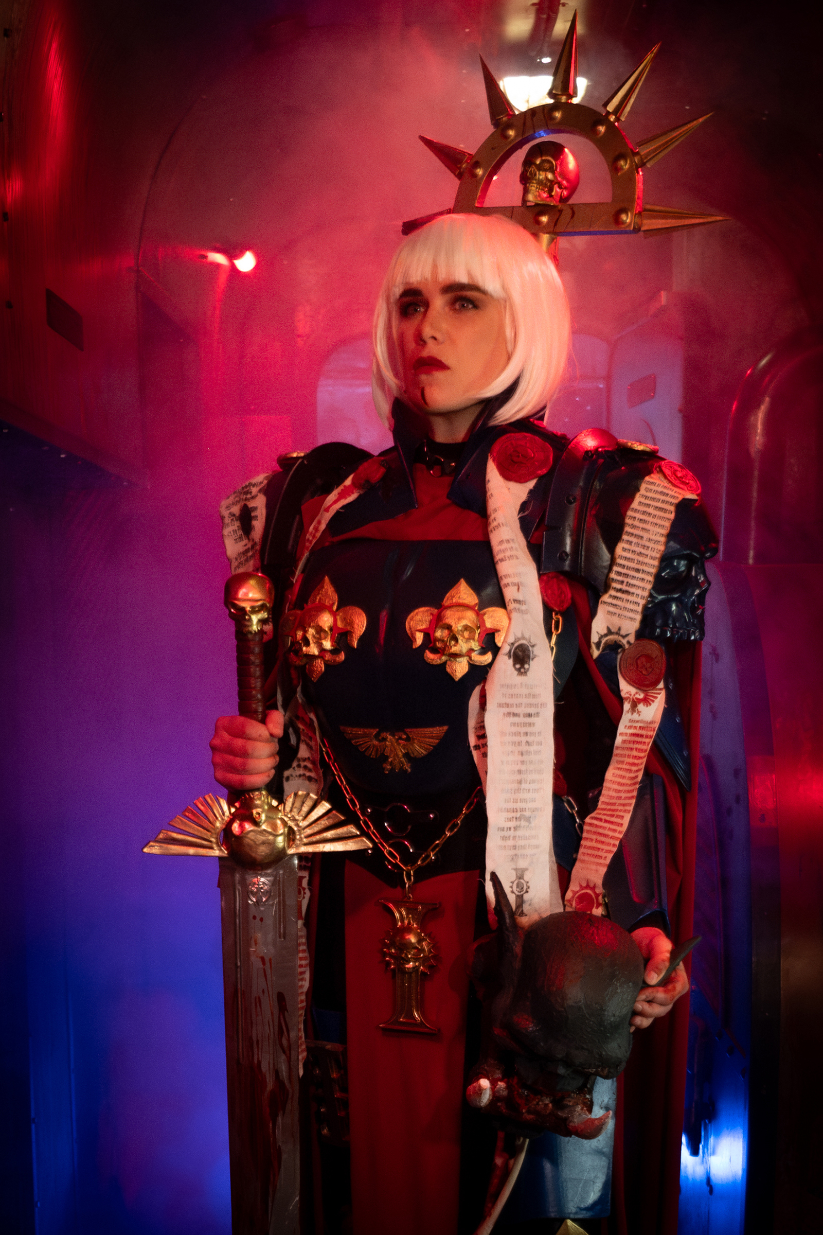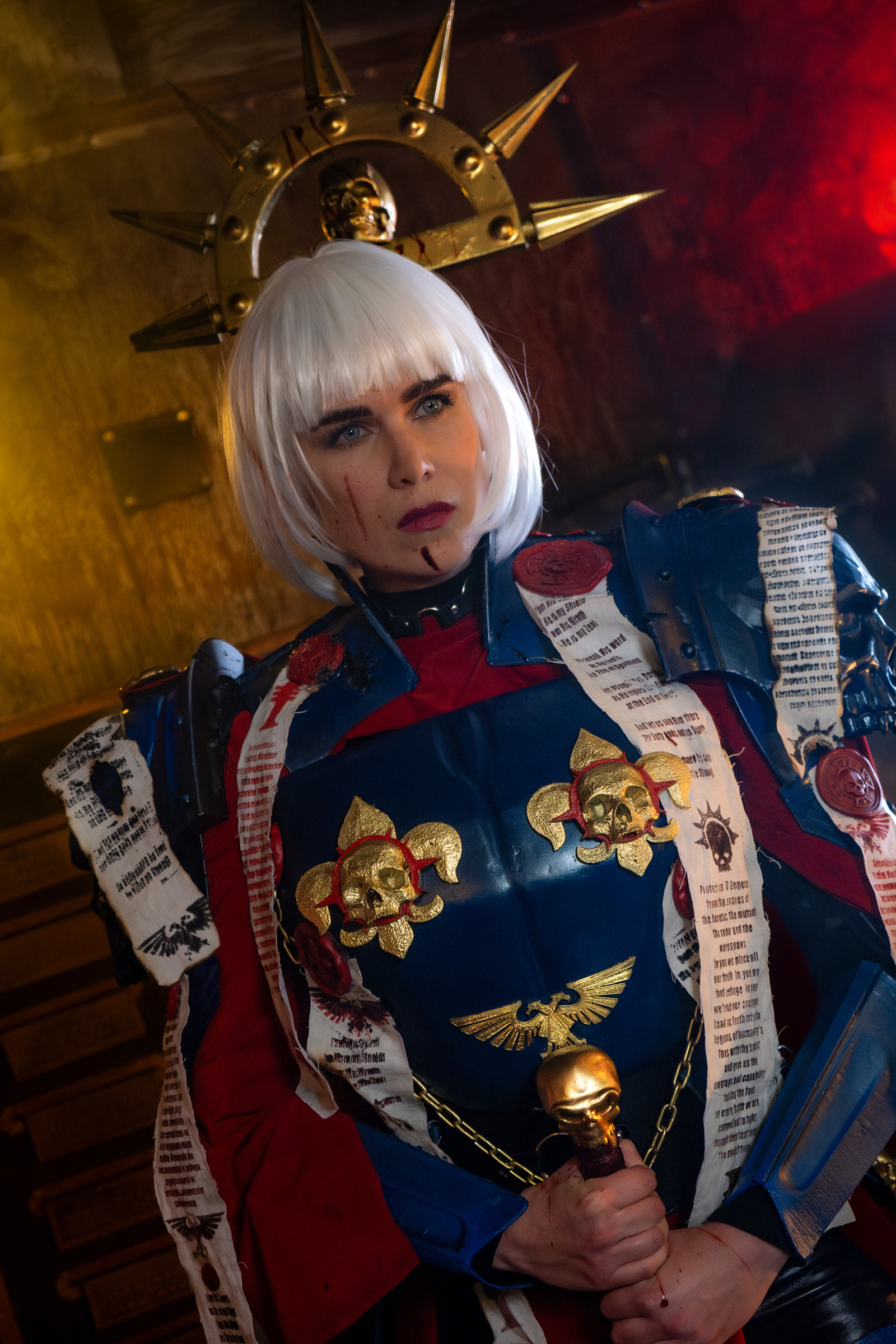 Пока ваха-любители красят миниатюры, мой муж сделал сороритку из меня. Распечатал на 3d-принтере доспехи, покрасил, закрепил на мне, отснял. Вот наш косплей Adepta Sororitas.