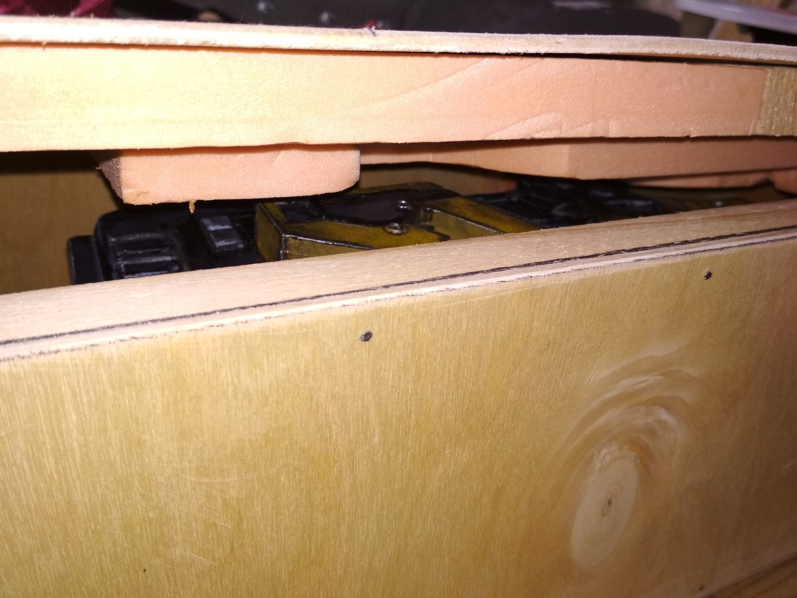 Просто вырезаю очередную стенку. Но вместо того, чтобы прибить, я прикрепляю изнутри к крышке ограничивающие упоры, чтобы они точно входили между стенками коробки, препятствуя смещению крышки, когда коробка закрыта.