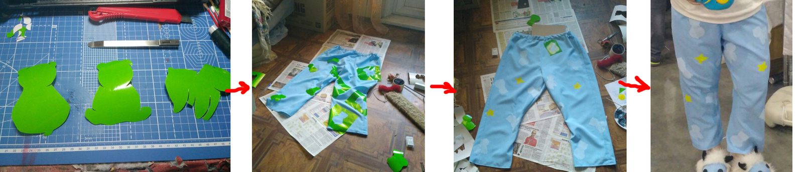 Пижамные штаны. То на что я убила два дня - это штанишки. В синематике не очень хорошо видно рисунок, было предположение что это мишки. Графити и фанарты подтвердили догадку, отрисовала мишек для трафаретов и перенесла их на пленку самоклеющуюся. Краска плохо просачивается через нее и я не боялась испачкать лишнюю ткань, пока красила штаны. Красила акриловыми красками при помощи спонжа, так цвет сразу получается насыщенным и хватало одного раза.