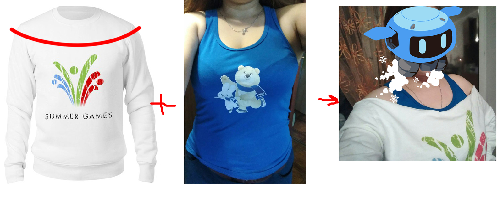 Кофта. В синематике у Мей очень потертая и растянутая кофта, было принято решение, что самое просто это заказать принт на худи и потом перешить горловину под то как оно должно быть в оригинале. Подруга очень выручила с тем, что сделала потертую картинку для печати и отдала свою старую синюю майку (Маккой, привет!). За день в одной классной конторе мне отпечатали худи и привезли. Можно было начинать перешивать и дорабатывать это добро. На картинке показано как обрезала и лучшее применение маек зимней Олимпиады в Сочи =D Извините за фото, достаю то что есть в архивах. Сверху для того, что бы кофта не падала пришила её к топику.