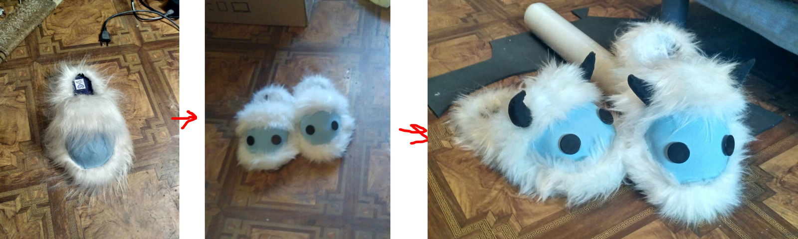 Тапочки. Любимая часть костюма! После выставки перекочевали в мои домашние тапочки. В основе обычные домашние тапки, которые нарощены EVA до нужных объемов, потом обтянуты остатками ткани со штанов, и украшены мехом, пуговками и рожками.