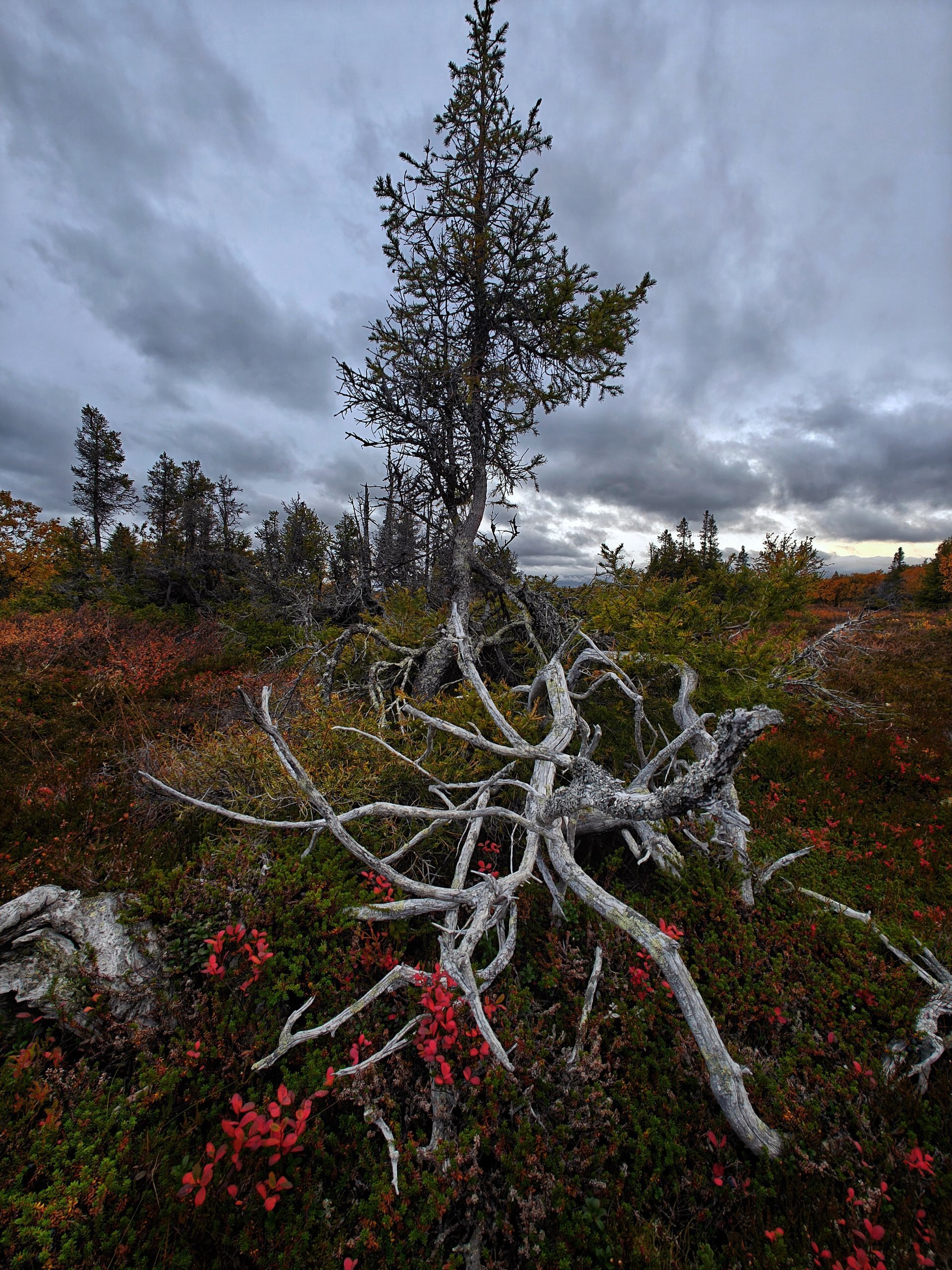 Выветренные до белого состояния стволы засохших деревьев, издалека кажутся костями диковинных животных, раскиданных по тундре.