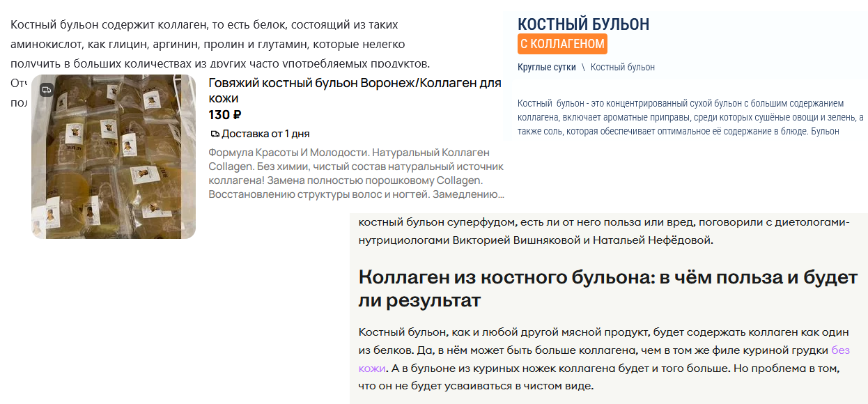 Много готовлю и очень это дело люблю, при этом стараюсь всегда искать информацию о физике и химии происходящих процессов, ибо многие кулинарные приёмы сродни шаманизму - никто не знает почему и зачем надо делать так, но делают. Например, солят воду при приготовлении на пару) Но то, что я обнаружил намедни в поисках метода заготовки бульонов впрок меня поразило, вместе с результатами беглого гуглежа, итак, маркетплейсы, комсомольская правда, продаваны-изготовители и даже 2 диетолога в статье ВкусВилла утверждают, что в костном бульоне есть коллаген и он невероятно полезен для всего подряд: