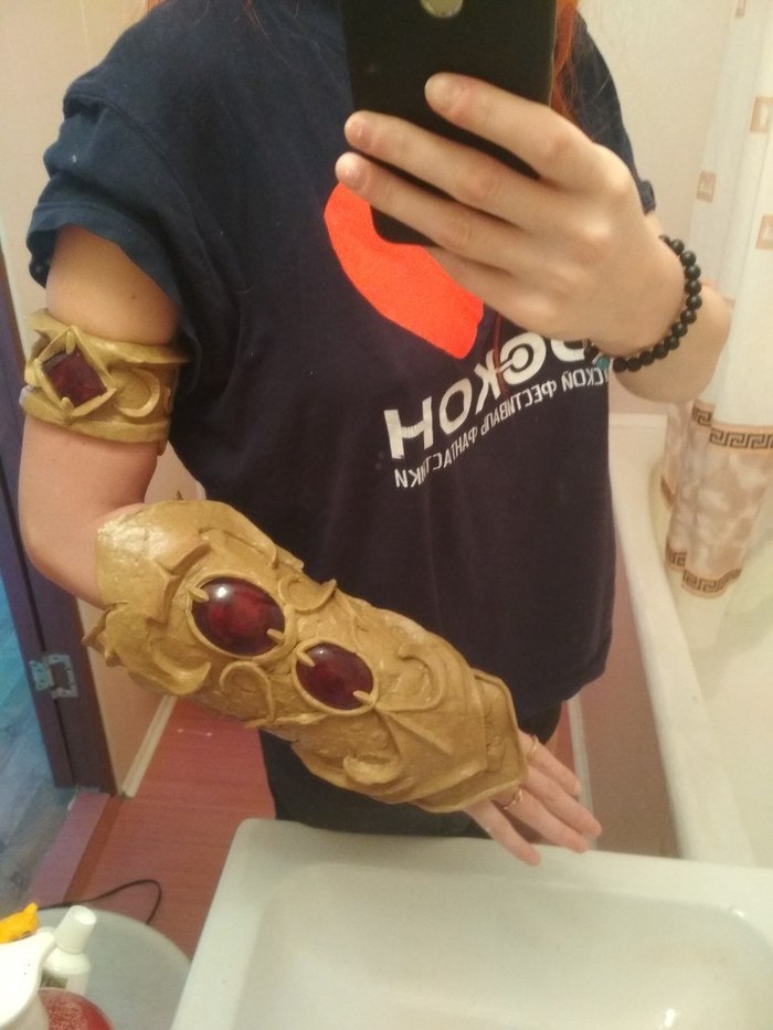 Таким же методом я делала все остальные доспехи. Конечно, где то я теряла время на детализацию. Так как многие узоры давались мне с трудом. Кстати, не будьте , как я и работайте в перчатках. Я очень сильно обжигала себе пальцы,резала ножом канцелярским, а один раз даже уронила фен на руку из-за чего несколько дней не могла нормально работать! Будьте аккуратны!