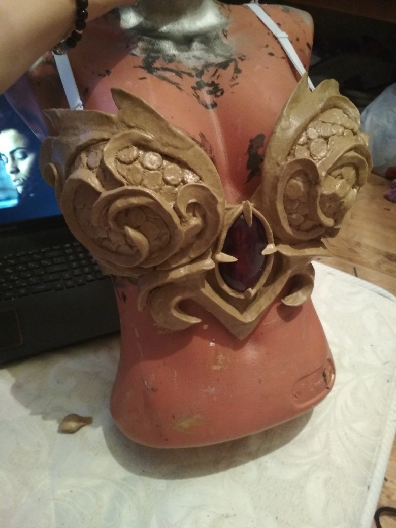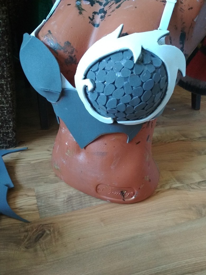 Сначала делаем основу на бюстгальтере своего размера, основа — это первое, что я делаю из Евы. Как только основа у нас готова, перехожу на детали (чешуйки и плоские узоры), после этого берусь за первый материал с которым очень давно хотела поработать Worbla. Отрезов квадратный кусок, который перекрывал обе половины нагрудника, стала его разогревать прям на основе строительным феном. Немного подождав квадратный лист под температурой начал принимать форму моего нагрудника, чтобы он плотнее ложился -сильнее грела эти части, а чтобы он втекал в разъемы между чешуйками я его вдавливала инструментом. Все узоры, которые были на арте они выпуклые. Так как я делала заготовки плоские ,то прям по ним из той же Ворблы я их лепила.