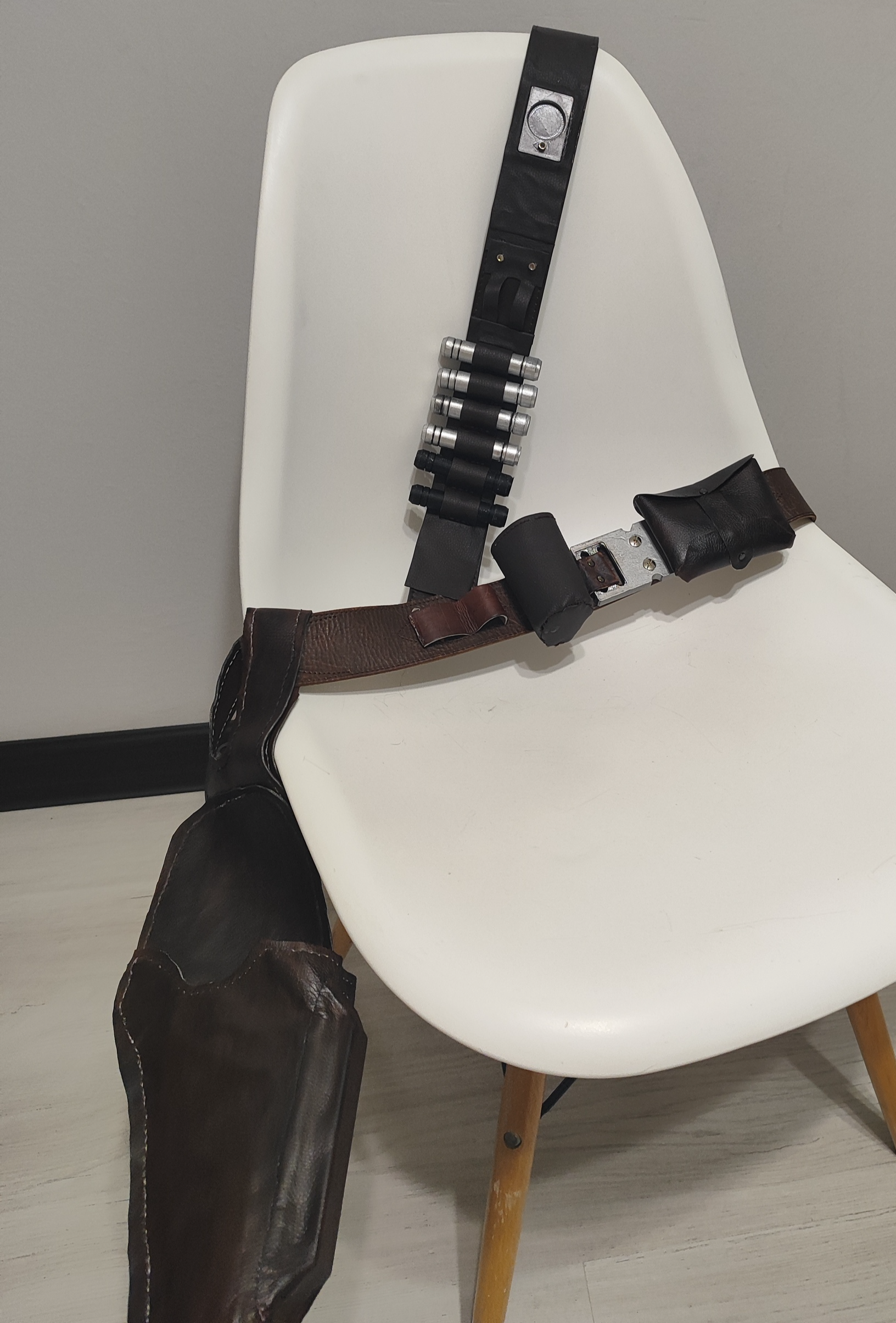 На вспомогательный пояс деньги тратить не хотелось, поэтому сделал сам. Взял два обычных ремня, соединил их винтовыми клёпками, нарезал экокожу и пришил/приклеил подсумки и патронташ. Кобуру для бластера сшил из экокожи, местами помог клеем.
