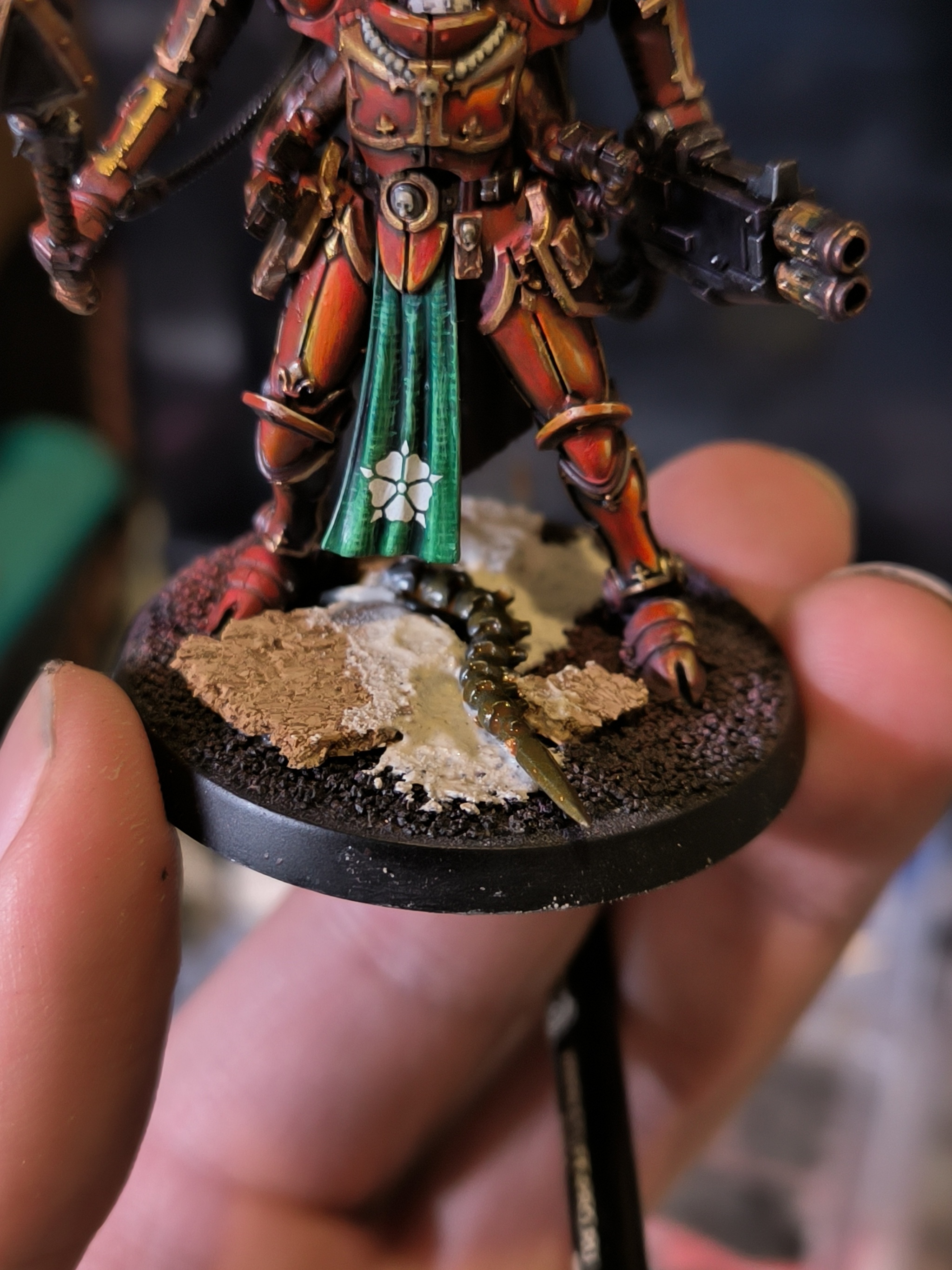 Потом пролил медь серафим сепией и восстановил уже золотом, так золото получает прекрасные рыжие тени. Также нанес хайлайты на красный и продолжил лисировку брони
