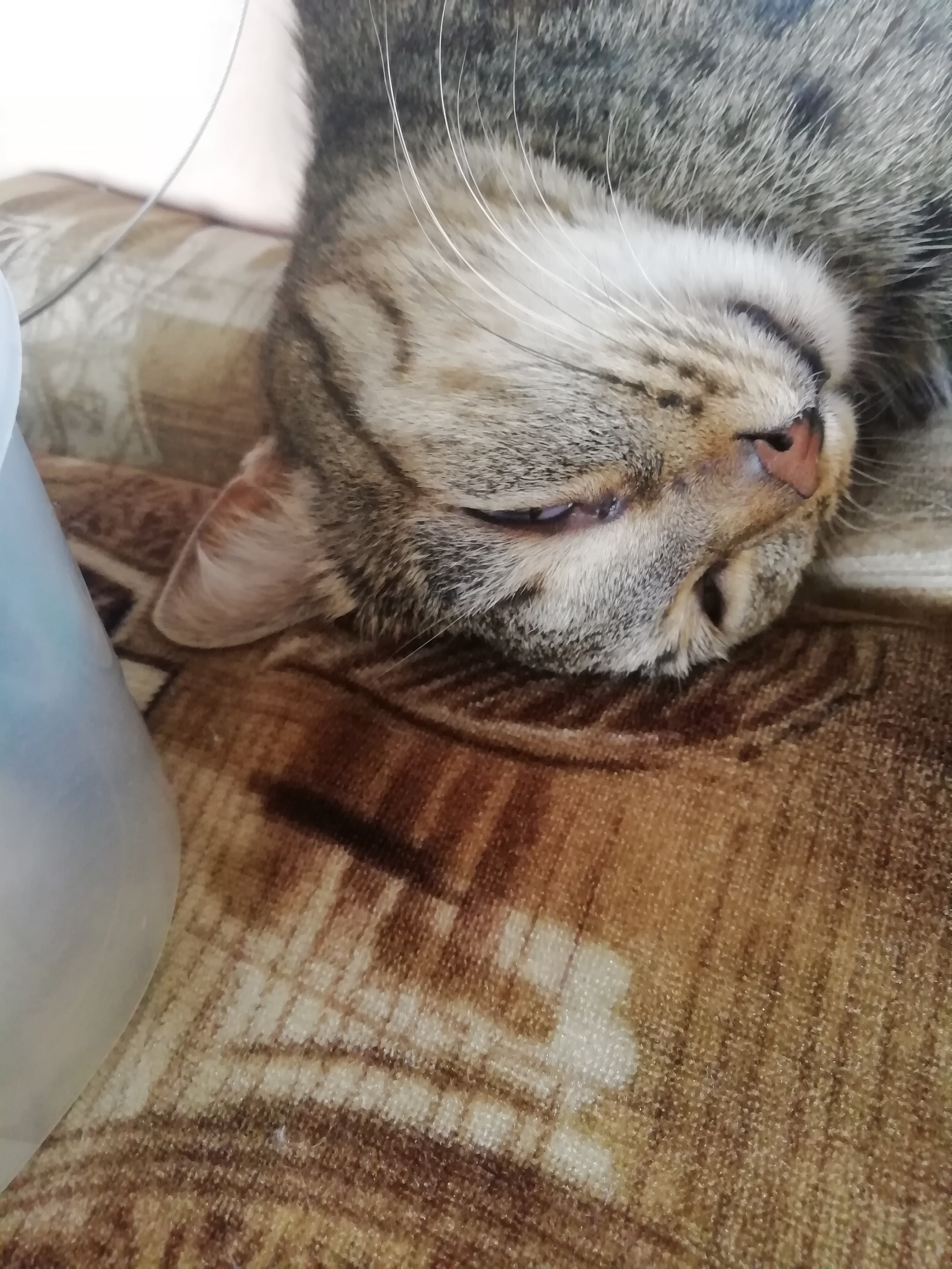 Я вяжу, а она спит на коленках. Но вид такой, будто сдохла.