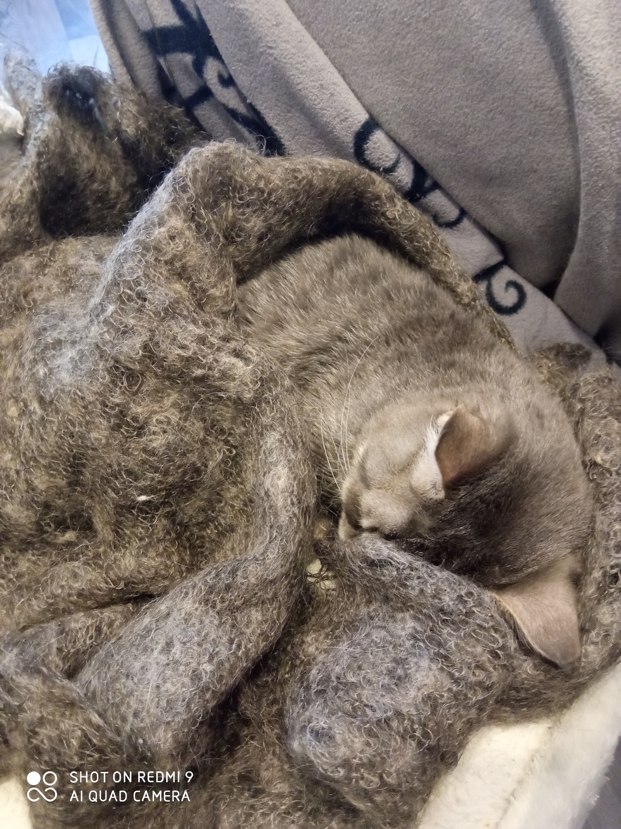 Спал на кресле рядом со мной пока я работаю, я его укрывал, т.к он постоянно мерз.