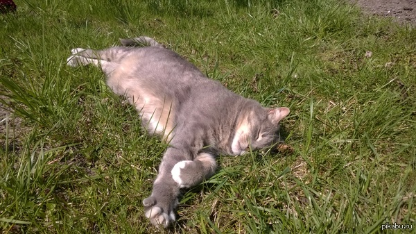 Кот дрыхнет на лужайке.