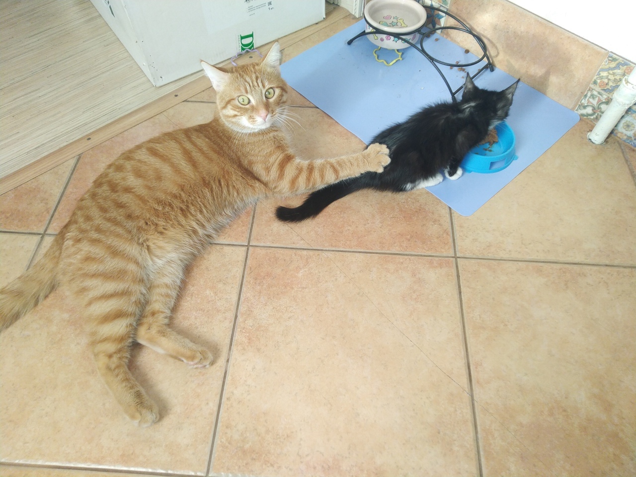 Кормим вместе, чтобы у него было положительное закрепление того, что когда она рядом, ему дают еду, а еда - это хорошо, значит и мелкая - это хорошо. Но проблема в том, что плохой он ее особо и не считает, просто когда она куда-то идет, он на нее прыгает, а она пугается и начинает дико орать. Отгоняю его брызгалкой, он отходит, потом подходит обратно, и глядя на меня начинает ее лизать, мол смотри, я супер, она супер, я отец-героин, она даже умываться не умеет. И под шумок опять начинает ее прикусывать. Еду не отбирает, спокойно смотрит, как она ест, игрушки вроде тоже не жадничает.