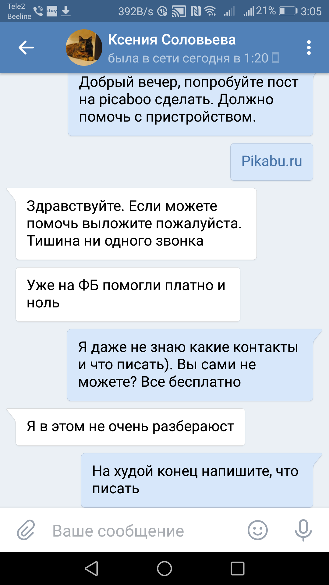 Предложила автору написать пост здесь - тут котиков любят и много адекватных людей. Соответственно, больше шансов найти хорошего хозяина. Автор сказала, что ей платно публиковали данный пост на фейсбуке и пока ни одного звонка (я вообще удивляюсь...котикам объявления писать платно).