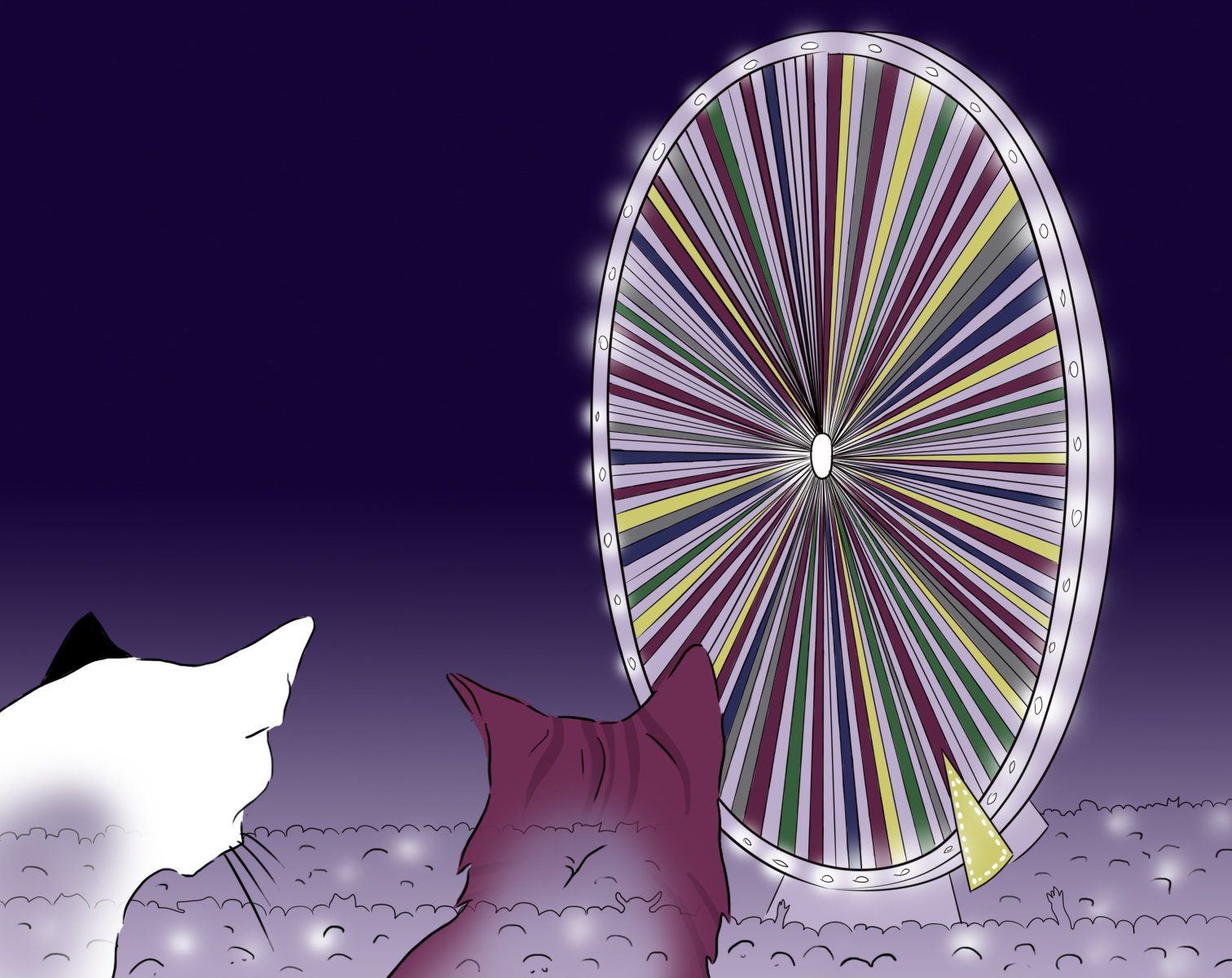 - Что-то мне это не нра... - Рыжик не успел договорить как свет поглотил их.. Ослеплённые коты долго не могли прийти в себя. Когда пелена с глаз спала они увидели огромных..нет гигантских размеров светящееся колесо фортуны, а вокруг сплошное темное пространство. Коты оказались в бесконечной толпе странных существ, которые были больше похожи на призраков.