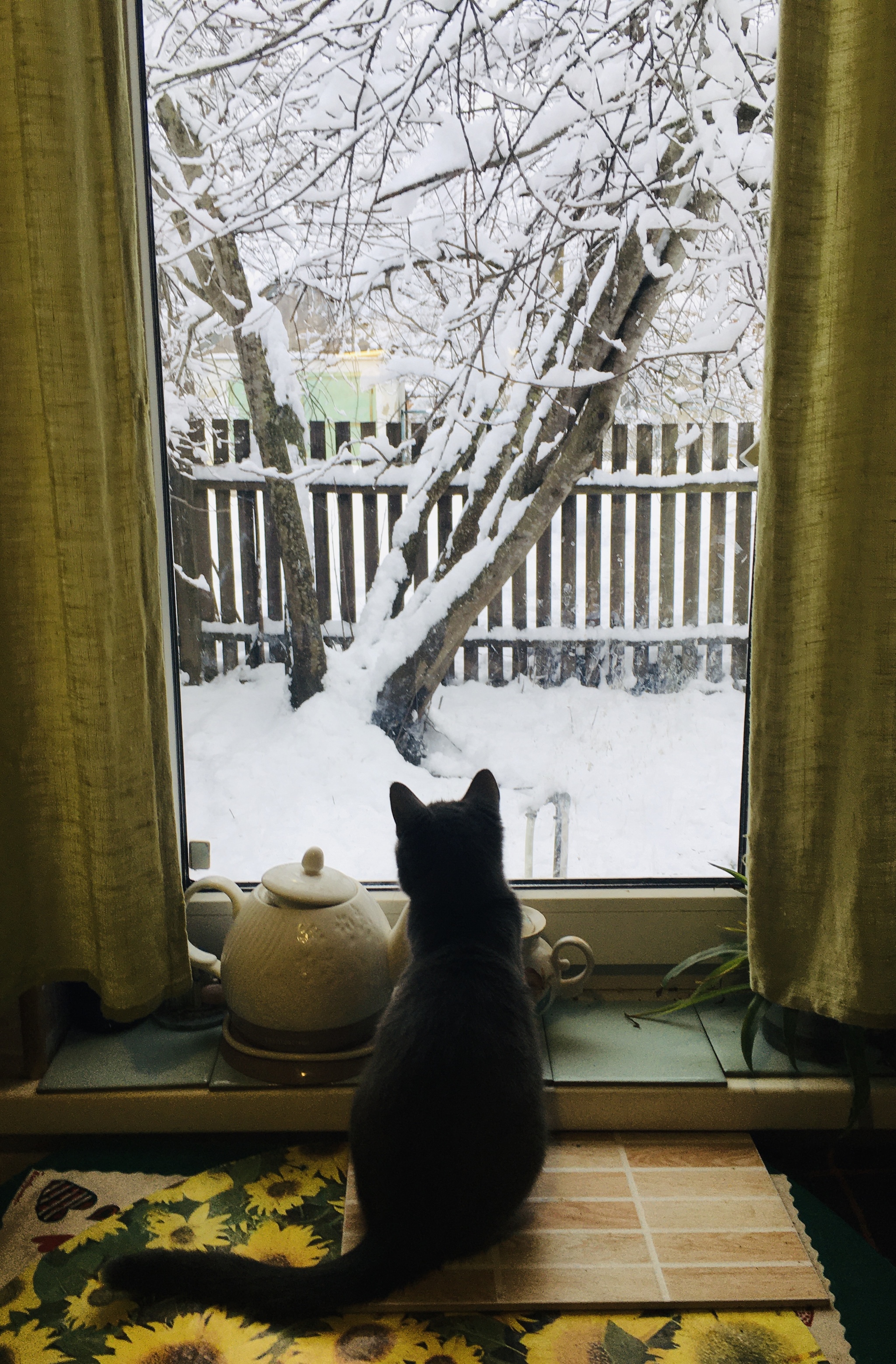 Удивил меня сегодня мой котик-подросток, обычно дурашливый, бегучий и прыгучий. Часа три вот так неподвижно созерцал, как с веток тихо осыпается снег. Лишь изредка головой шевелил. Сидел, как статуэтка и, по-моему, мечтал и медитировал.