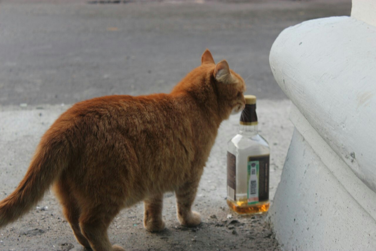 Как- то однажды летом , гуляя по улицам родного города, я заметила рыжего кота. Подойдя поближе - заметила, что он яро обнюхивал бутылку с содержимым. Все бы ничего, но он от нее не отходил где то минут десять. А в конце у кота явно читалась улыбка на мордочке.