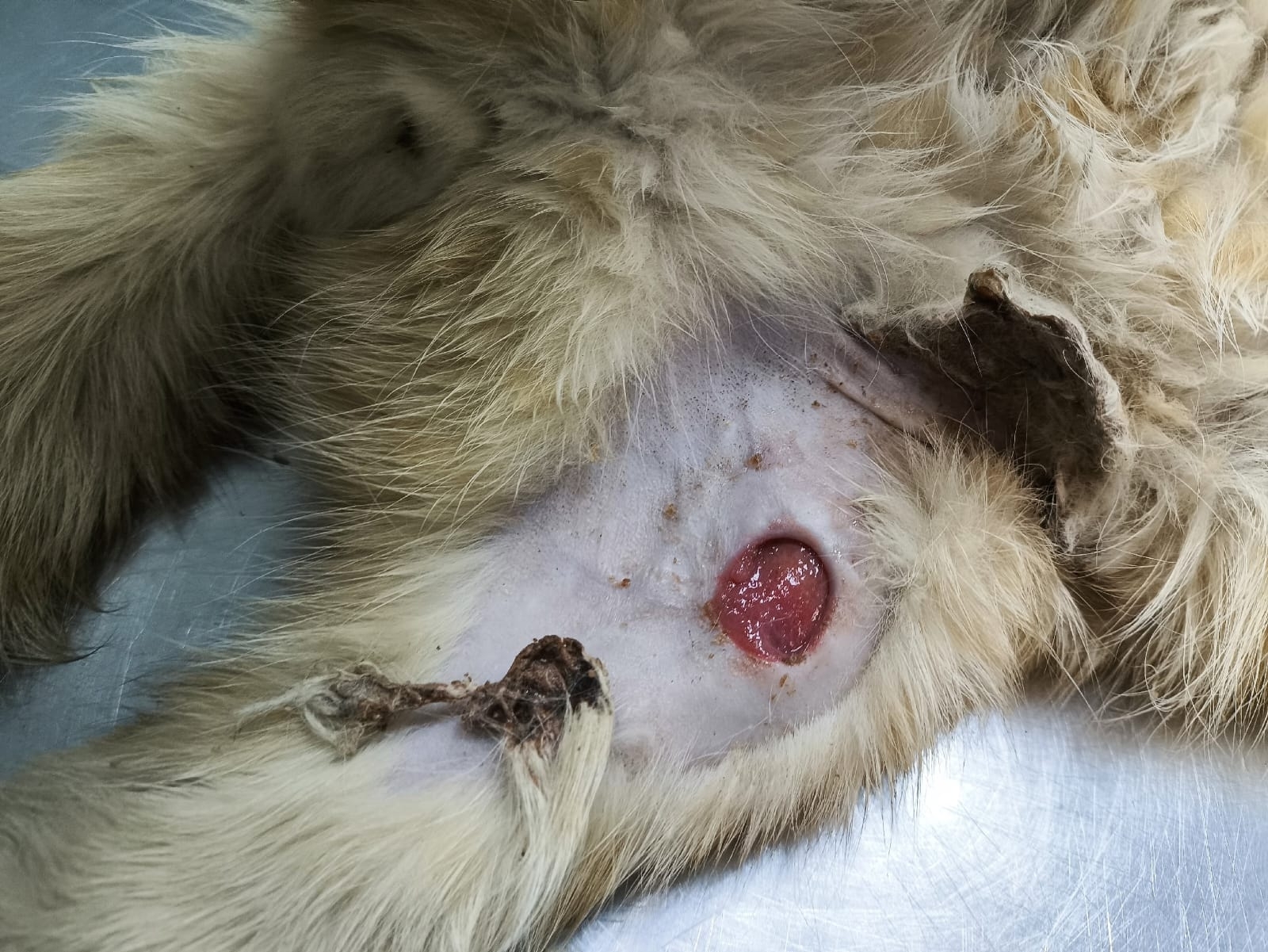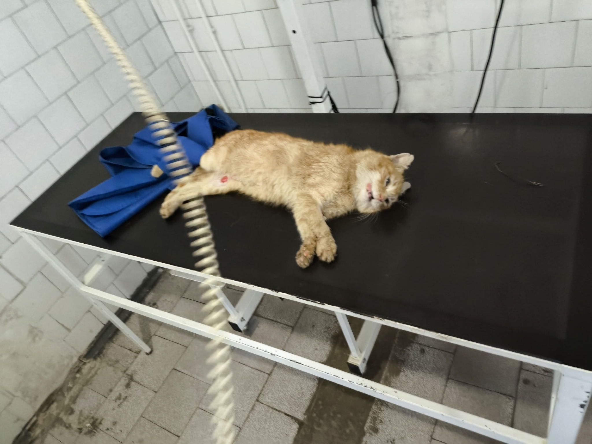 Кот был отловлен и отвезён в клинику, где на ренгене увидели старый перелом , который сросся неправильно, но жить ему не мешает, удалили три последних зуба и обработали ту самую рану - дырку без кожи.