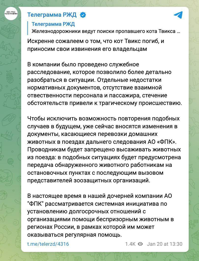 Только что прочитал, что кота, которого проводница выставила из поезда, нашли мертвым. Его, очевидно, загрызли собаки.