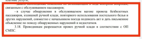 Я приведу пример, если пассажиры вынесли свой багаж и свалили в тамбур, и теперь багаж стал мешать проводник осуществлять свои прямые обязанности - она может сама решать как поступить, вплоть до того чтобы не разбираться а Выкинуть непонятный багаж без явных владельцев на улицу. Представляете? Вообще не обязана с каждым радикюлем бегать по вагон и искать кто владелец.