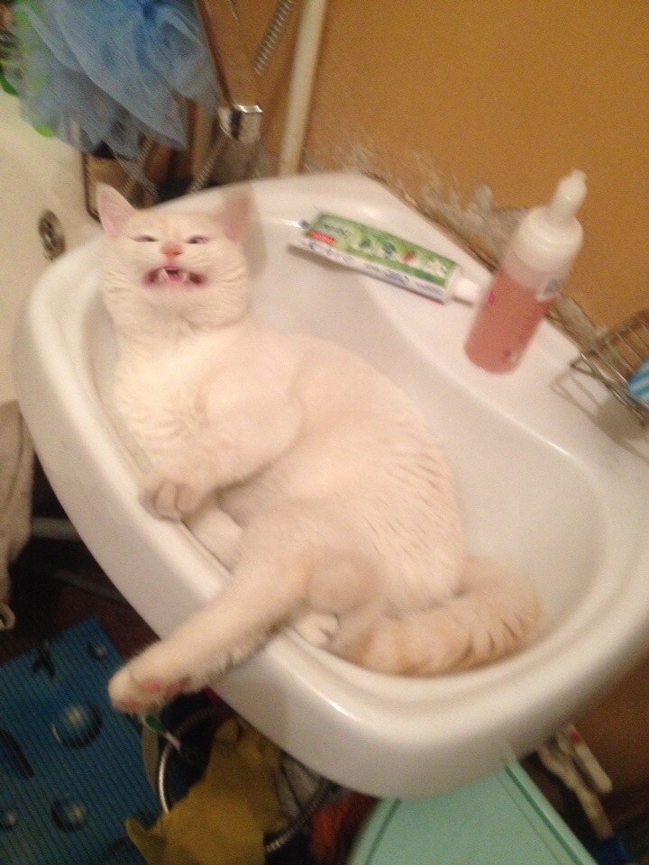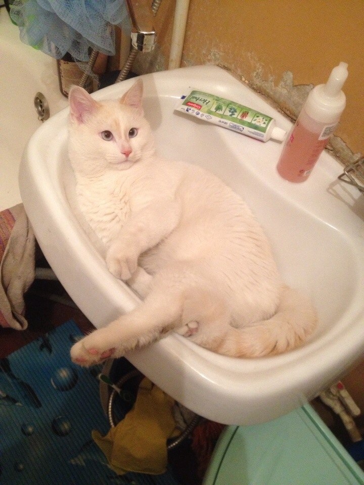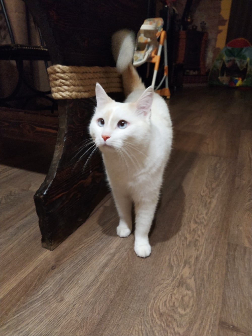 Долго размышляли, как его назвать. Такого необычного, белого, косоглазого кота с синей радужкой не хотелось называть каким нибудь обычным "мурзиком". В конце концов, было найдено японское слово "юки", что означает снег. Оно, кстати, тоже применяется в качестве имени или клички. Если я ничего не напутал)