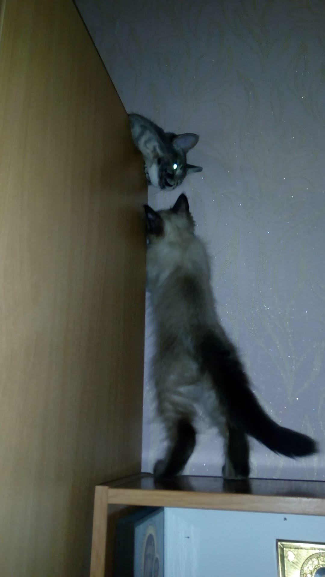 Маняша вообще очень любит, когда все идет по определенному алгоритму. Так, ещё до появления Ланса, она обожала бегать за бантиком на верёвочке и быстро придумала такую штуку: бежит за игрушкой по коридору, забегаем в зал и пока я оббегаю диван, она проскакивает за ним, «неожиданно» выпрыгивает мне на встречу и когтит бантик. Потом ходит счастливая – перехитрила!)) Как-то раз я решила изменить игру и, добежав до середины дивана и заметив, что Маня уже смотрит на меня из засады, развернулась и побежала обратно в коридор. Как она обиделась на то, что я поломала ей игру! Пришлось возвращаться и позволить довыполнить алгоритм))) Вот и убегая от Ланса на шкаф, Маруся всегда делала это определенным образом: сначала запрыгивала на стул, потом на стол, на полочку и на шкаф. Однако дети растут быстро, и вскоре Ланс смог с полочки дотянуться и заглянуть на шкаф, а потом круто поменял игру. Он, в погоне за Маняшкой, запрыгивал сразу на стол, чем выигрывал время и оказывался на шкафу первым. Маня подвисала, но отменить алгоритм не могла и, потупив, запрыгивала на шкаф, а Ланс её перехватывал. Но, как я писала в предыдущем посте, порой Маня вываливалась из своего параллельного мира в наш, и в очередной раз это произошло во время догонялок. Ланс уже взлетел на шкаф и замер в предвкушении, как вдруг Маруся тормознула на столе, затем развернулась, спрыгнула на пол и дёрнула к дивану, где завалилась на «козырную» подушку. Очень жаль, что под рукой не оказалась фотика, ибо передать всю гамму эмоций Ланса словами просто невозможно, суть их заключалась в: «Обманула!!!». Маня выглядела примерно так: