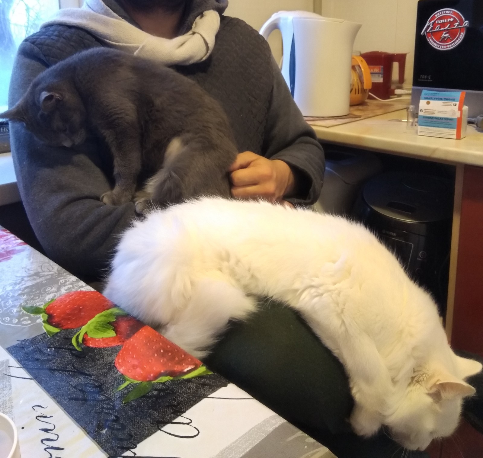 Сижу дома на больничном, котейки ни на шаг не отходят - греют душу и лечат)