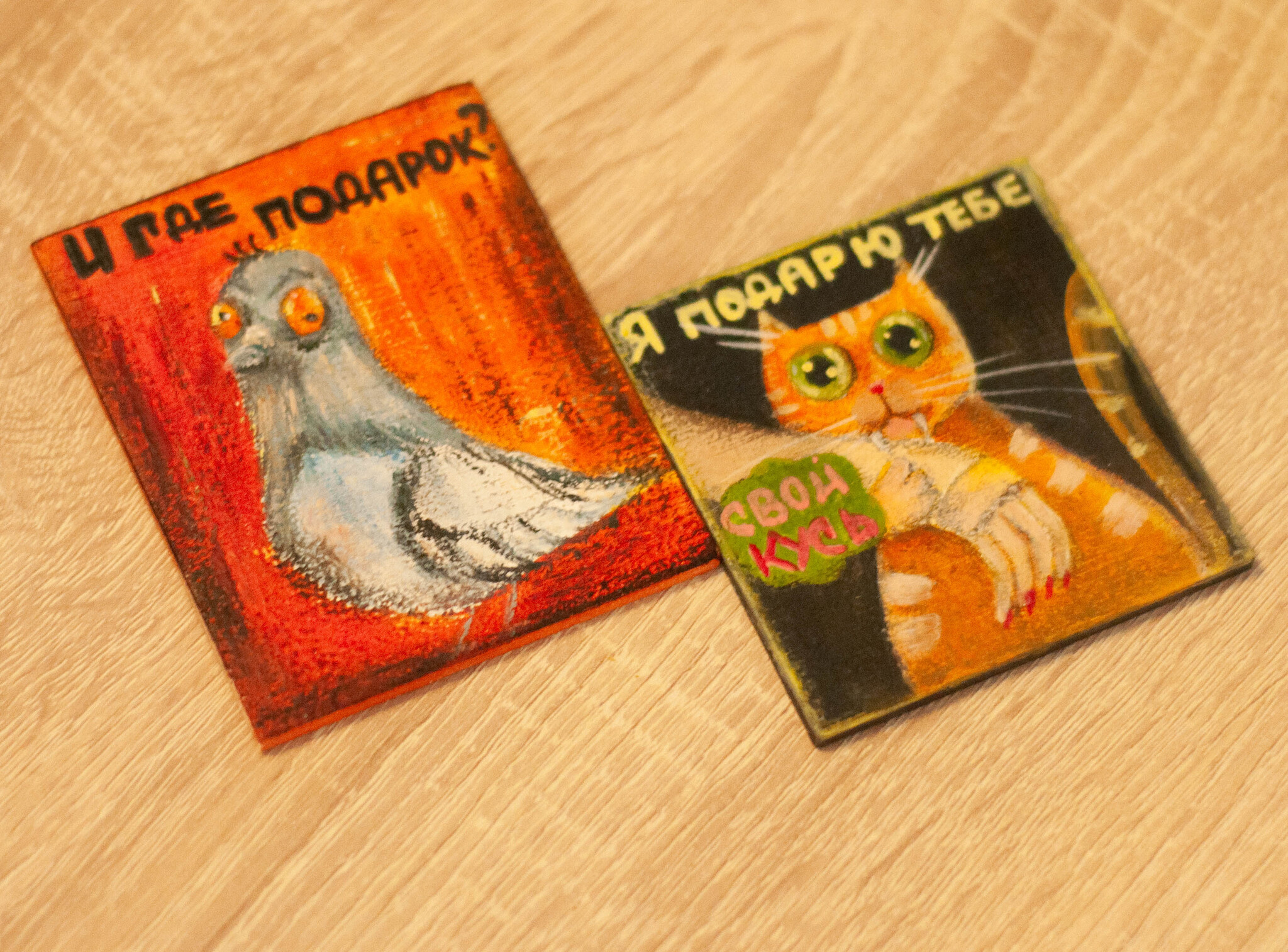 176 ElinkaUglova39 Пишу картины и вяжу уют Сказочная мастерская Котик дарит подарки, а голубь только требует 1 день назад И как жить при таком раскладе? У котика болючие и кусачие подарки 🎁, а у голубя вообще никаких. Вот такая парочка магнитов появилась на днях. Основа дерево (фанера+грунт). Смешанная техника: акрил+ масляная пастель. Покрытие: художественный лак. [моё] Декор Смешные животные Анималистика Кот Голубь Мемы Лапки Сувениры Подарки Магнитики Кусь Забавное 23 7 1 Ещё 0